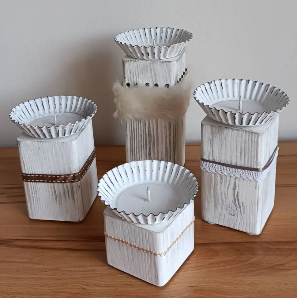 Sie sind natürlich in vier verschieden Höhen geschnitten worden. Bevor sie mit weißer Kreidefarbe auf Shabby gebracht werden, werden sie noch geschliffen. Ein Loch für den Kerzenhalter hinein. Zu guter Letzt mit einem schicken Band in liebevoller Handarbeit versehen.