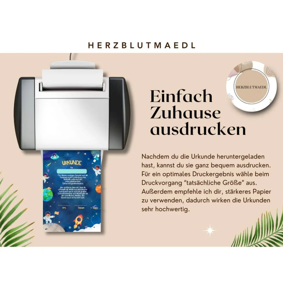 Farbabweichungen sind aufgrund unterschiedlicher Drucker möglich. Sieh am besten für ein optimales Farbergebnis in die Einstellungen deines Druckers. Viele Drucker haben einen Randbereich, der frei bleibt. Damit die Urkunde komplett ausgedruckt wird, wähle im Druckfenster unter dem Abschnitt „Seite anpassen“ die Option „Anpassen“. Dann wird alles von der Urkunde sichtbar sein. Der weiße Rand lässt sich bei haushaltsüblichen Druckern leider nicht verhindern.