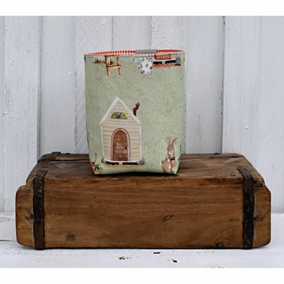 hellgrünes Utensilo mit im Garten arbeitenden Tieren, wunderschön illustriert