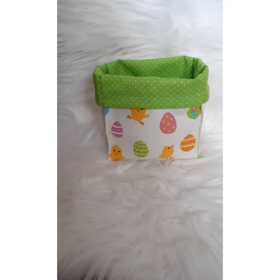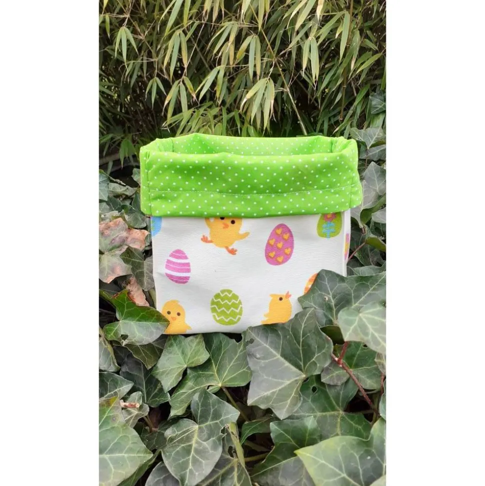 Der Außenstoff ist ein cremeweißer Baumwollstoff, der mit bunten Eiern und witzigen lustigen Küken bedruckt ist. Gefüttert ist es mit einem grünen Baumwollstoff mit weißen Punkten.