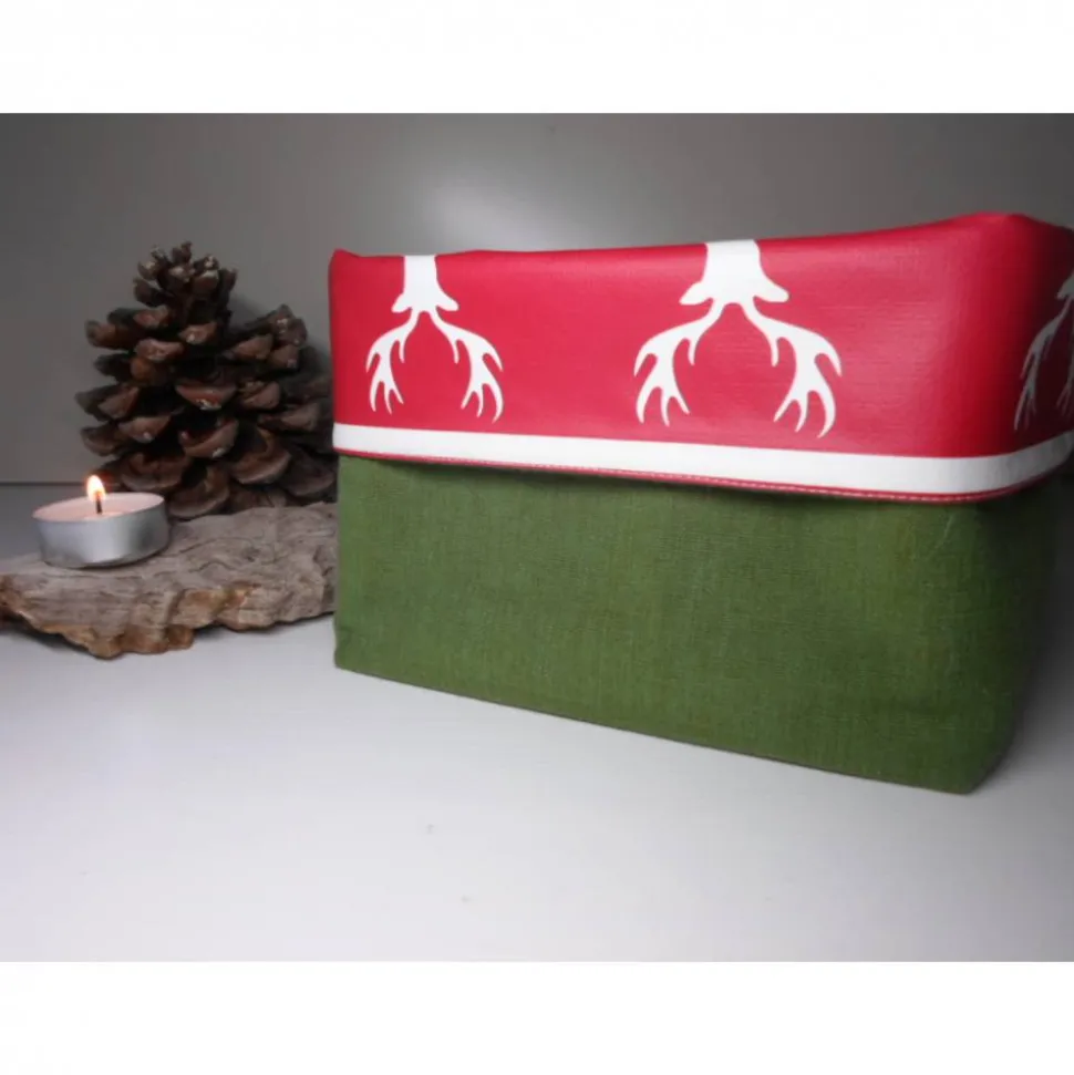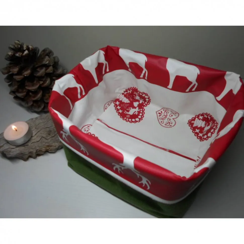 Man kann das Körbchen für Nüsse, Obst, Süßigkeiten, Brötchen, Gebäck oder andere Kleinteile verwenden. Wird es nach Weihnachten nicht mehr gebraucht, lässt es sich flach zusammen legen und mit den Tischdecken verstauen.