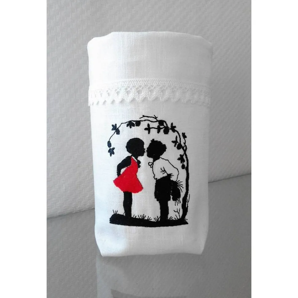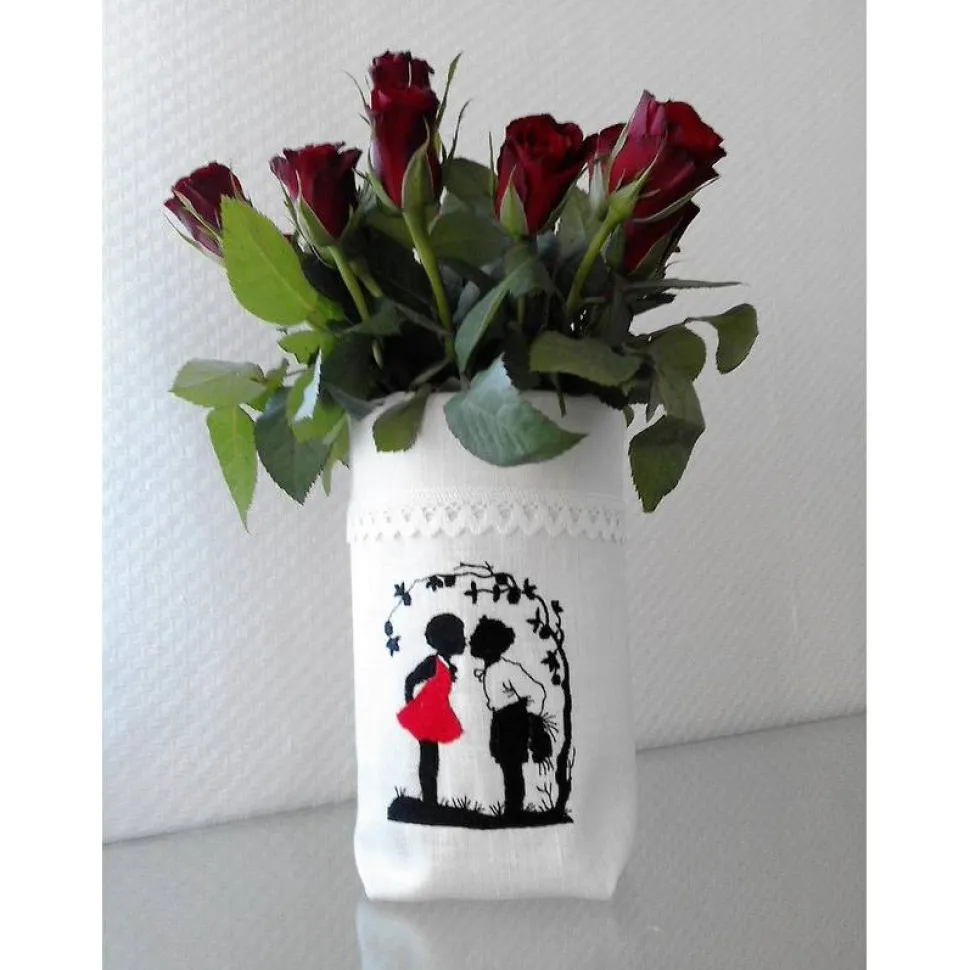 Der erste Kuss – der Beginn einer besonderen Erinnerung. Mit diesem liebevoll gefertigten Lichtbeutel aus Leinen bringst du romantisches Flair in dein Zuhause. Die edle Baumwollspitze und das bestickte Scherenschnitt-Motiv von FeinKram machen den Beutel zu einem echten Blickfang.