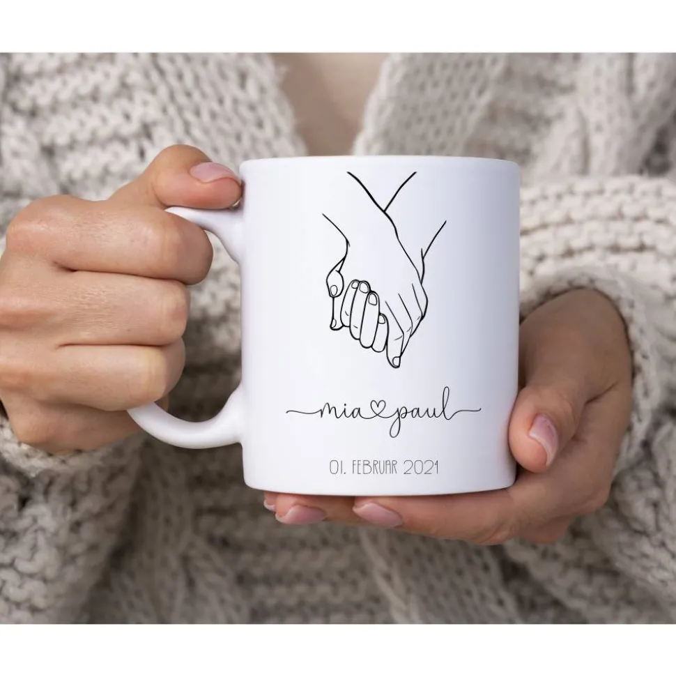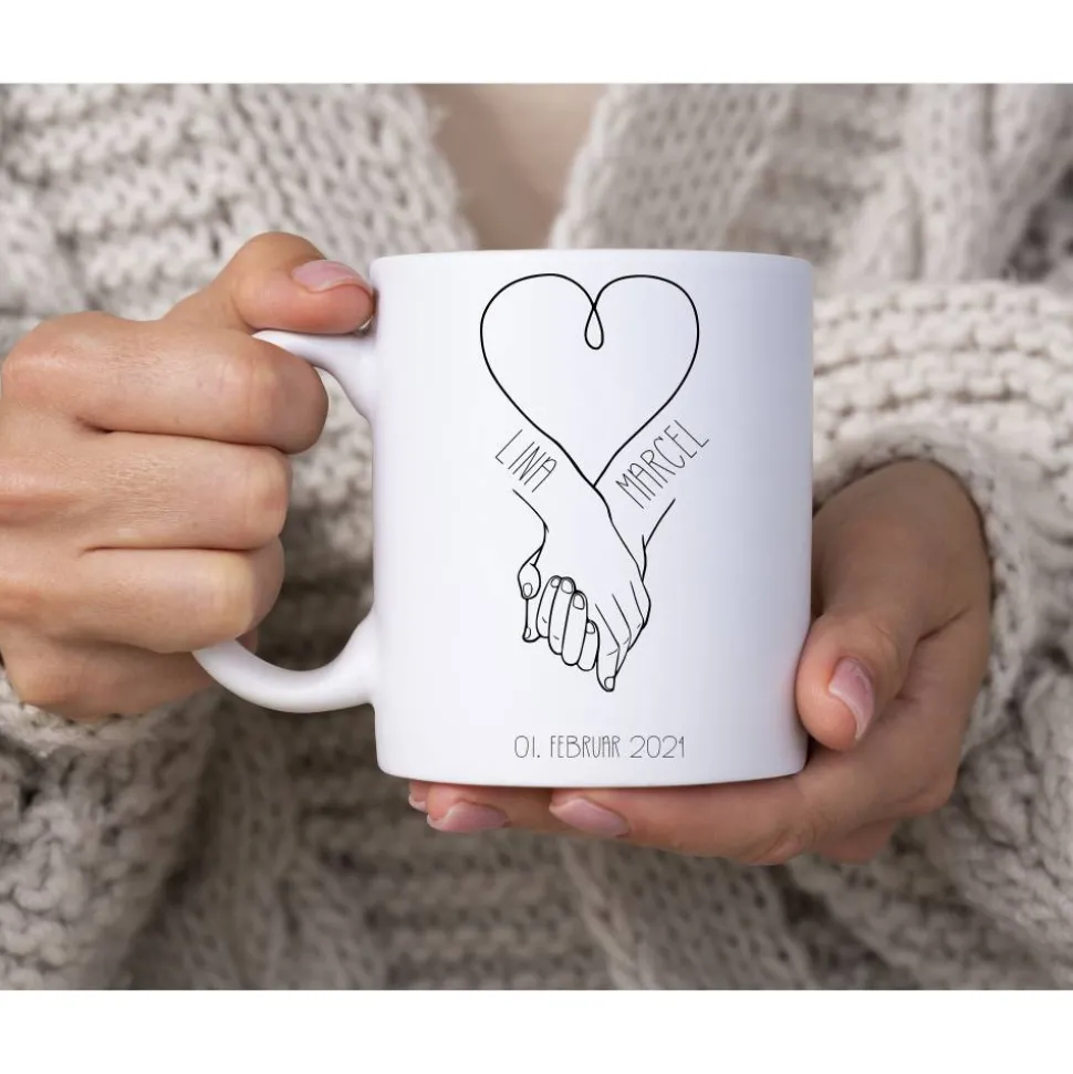 Personalisiert mit dem Namen und dem Verlobungsdatum ist der Kaffeebecher ein sehr persönliches Geschenk.