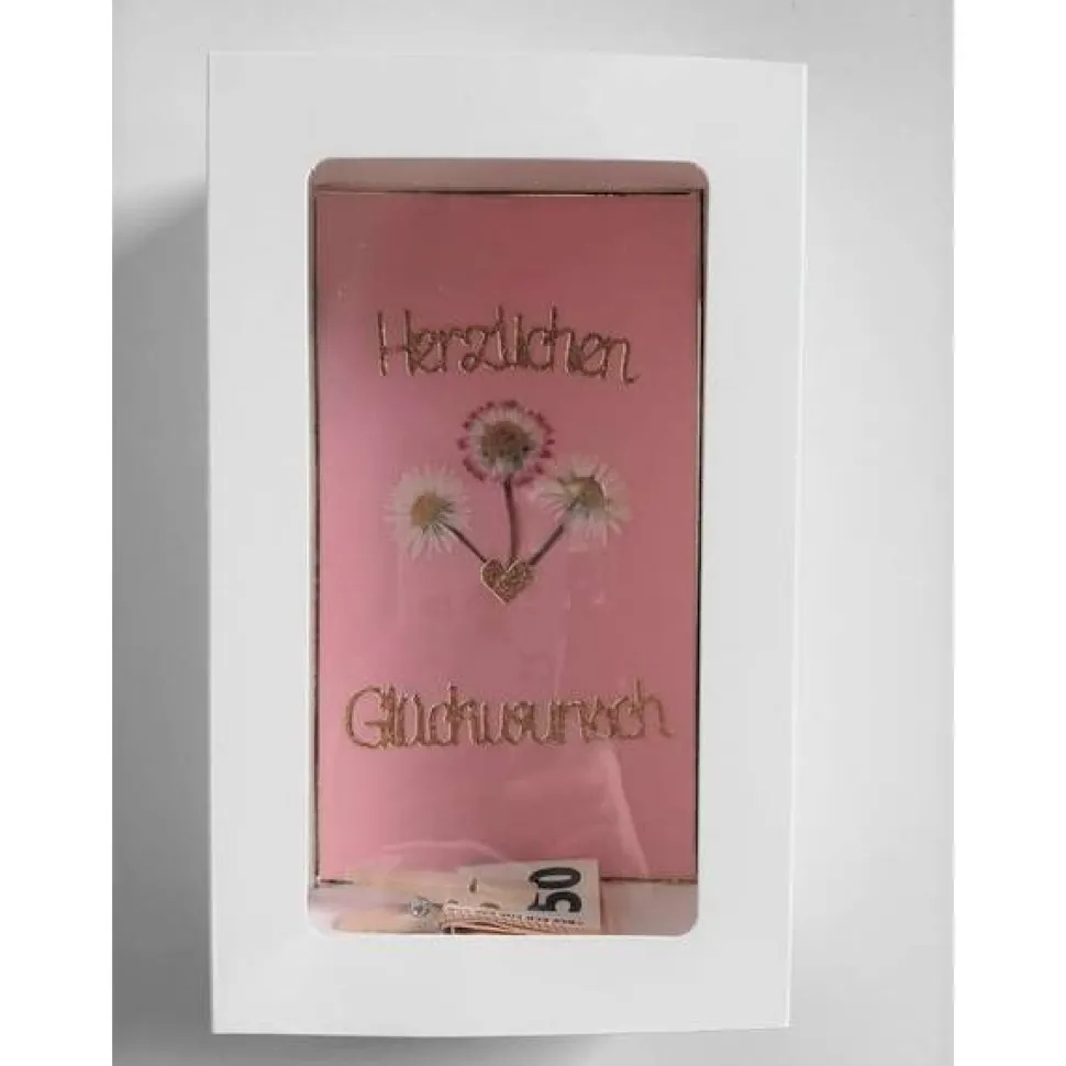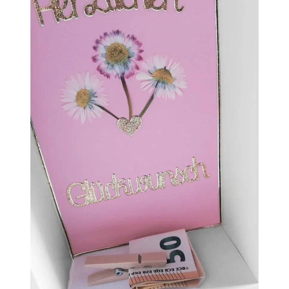 Die Verpackung besticht durch das Motiv: Gänseblümchen – drei echte, getrocknete und gepresste Gänseblümchen auf rosa Fotokarton. Der Glückwunsch-Text „Herzlichen Glückwunsch“ glänzt als Microglitter Sticker und eine kleine Holzklammer hält deinen Geldschein sicher fest.