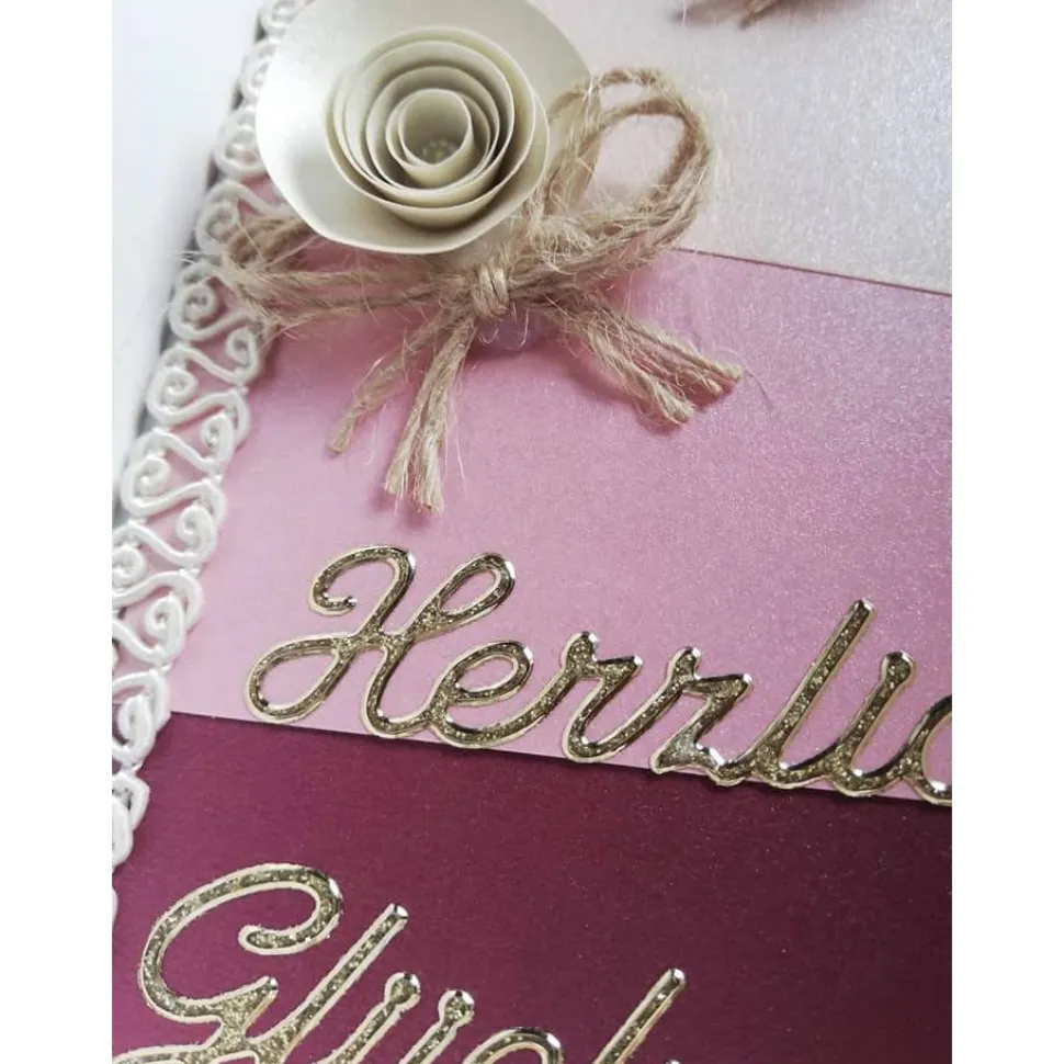 Motiv: Papierrosen auf edlem Designerpapier, dekoriert mit Juteschleifen und Bordüren. Der Schriftzug „Herzlichen Glückwunsch“ besteht aus funkelndem Microglitter-Sticker. Eine kleine Holzklammer hält den Geldschein sicher fest.