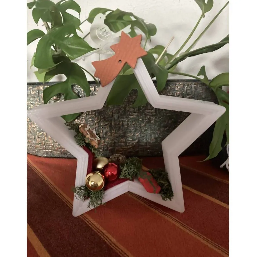 Grundmaterial für den fünfeckigen Stern ist ein aus wiederverwendbarem Material nach eigenem Entwurf angefertigter 3-D-Druck in leicht durchsichtigem weiß. Der Stern ist so breit, dass er problemlos frei steht und somit auch als Tischdekoration bestens geeignet ist.
