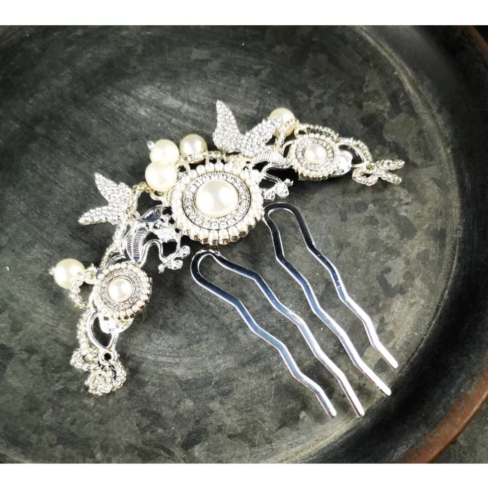 Dieser Haarkamm ist nur an den Zacken flexibel zum leichteren Einarbeiten in die Frisur. Das Ornament ist hier aus dickerem Metall (bitte nicht biegen).