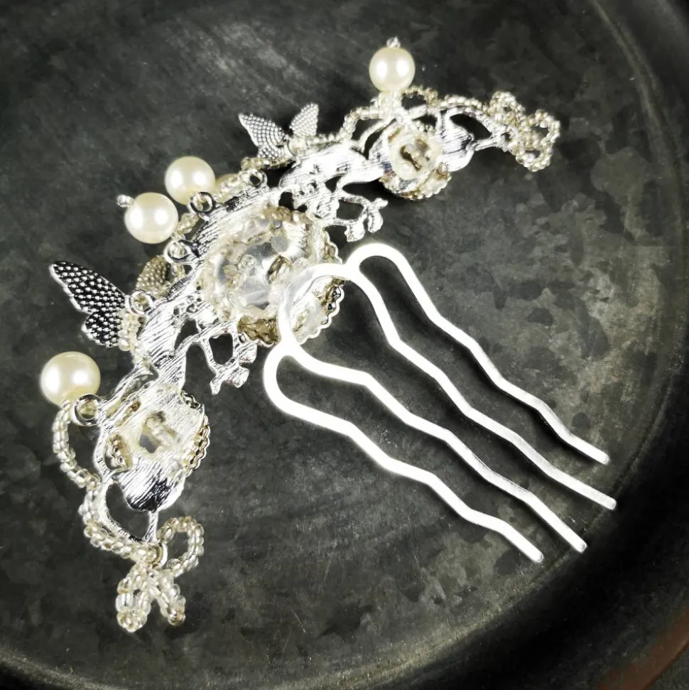 Der Haarkamm wurde mit unterschiedlichen Knöpfen (mit weissen kleinen Acrylperlen und Strass) üppig verziert. Umrandet werden diese mit kleinen, durchsichtigeb Glasperlen, großen weissen Glasperlen und Strasschmetterlingen.