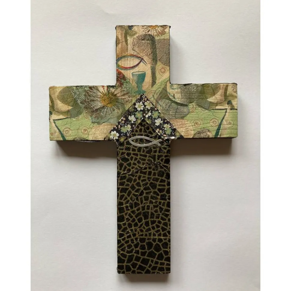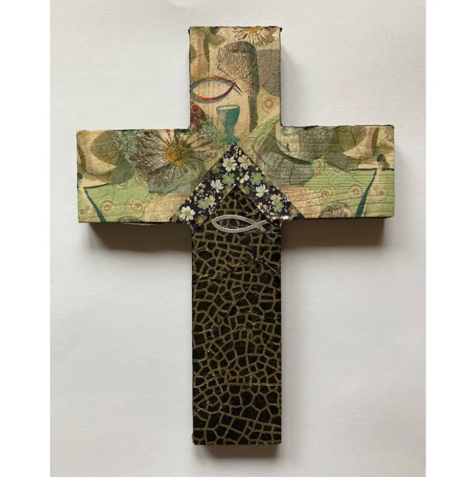 Das fertig-gestaltete Kreuz ist durch den verwendeten Kleber und Lack versiegelt, so dass keine Feuchtigkeit ins Papier eindringen kann. Zusätzliches Schmuckelement ist ein kleiner silberfarbener Fisch als Symbol für den christlichen Glauben.