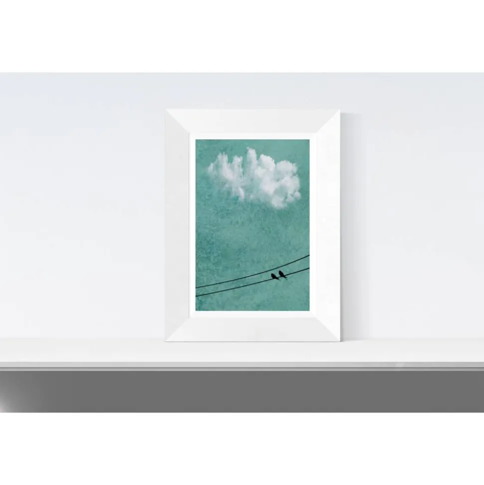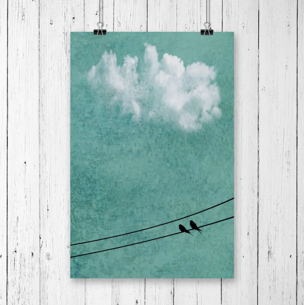 Der bezaubernde Kunstdruck in Grün zeigt ein Vogelpärchen, das auf der Stromleitung sitzt. Die flauschige weiße Wolke schwebt über ihnen.