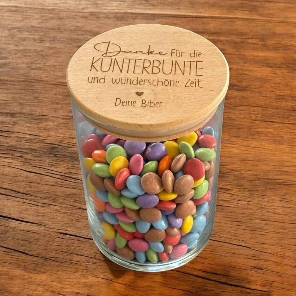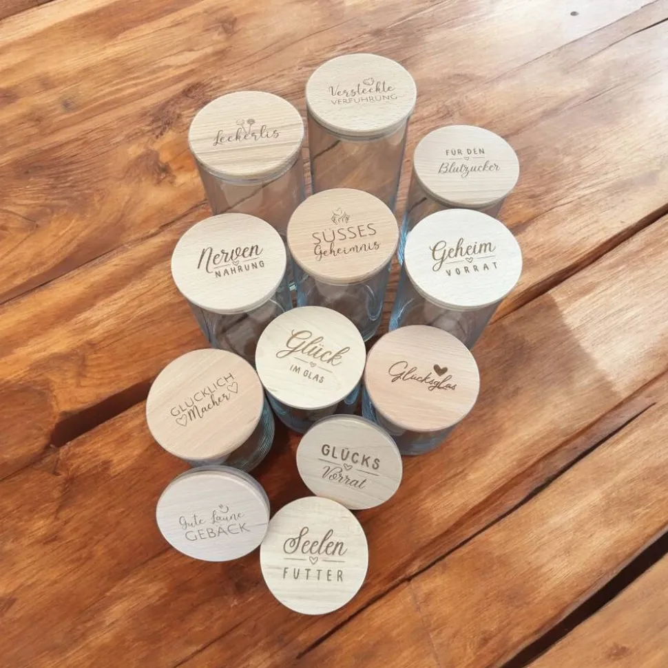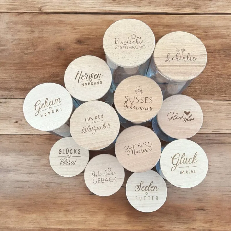 Das Vorratsglas ist in drei Größen 530ml, 880ml und 1210ml lieferbar. Das Gefäß besteht aus Glas und der Deckel zur Gravur ist aus hochwertigem Buchenholz. Die Gravur wird mit vielen verschiedenen Motiven hergestellt. Eigene Wünsche können angefragt werden.