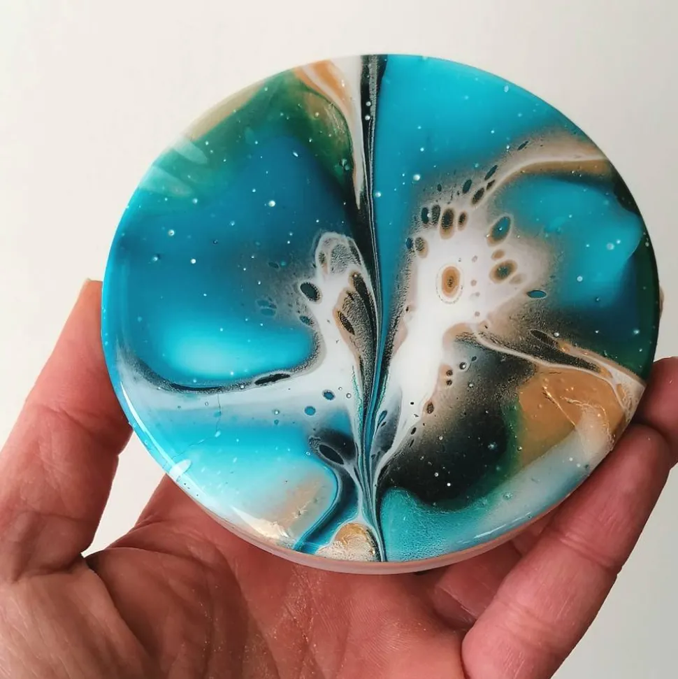 Dieses individuelle Vorratsglas ist mit einem hochwertigen, von Hand in Blau und Gold bemalten Holzdeckel ausgestattet. Jedes Stück ist ein Unikat, mit Acrylbildern veredelt, die auf den Deckel gegossen und mit Kunstharz beschichtet werden. Dadurch ist die Oberfläche abwischbar und besonders langlebig.