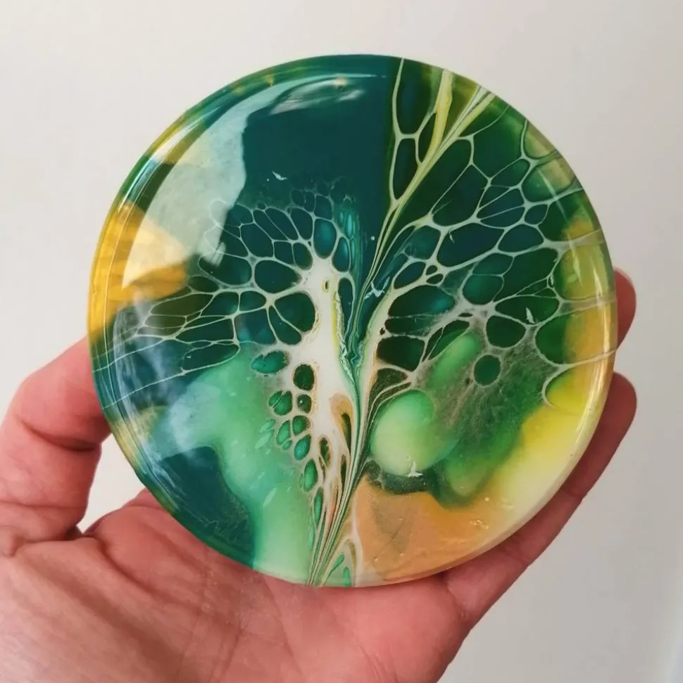 Dieses individuelle Vorratsglas ist mit einem hochwertigen, von Hand in Grün und Gold bemalten Holzdeckel ausgestattet. Jedes Stück ist ein Unikat, mit Acrylbildern veredelt, die auf den Deckel gegossen und mit Kunstharz beschichtet werden. Dadurch ist die Oberfläche abwischbar und besonders langlebig.