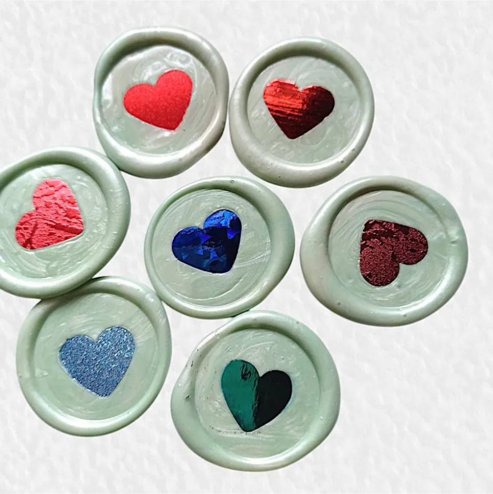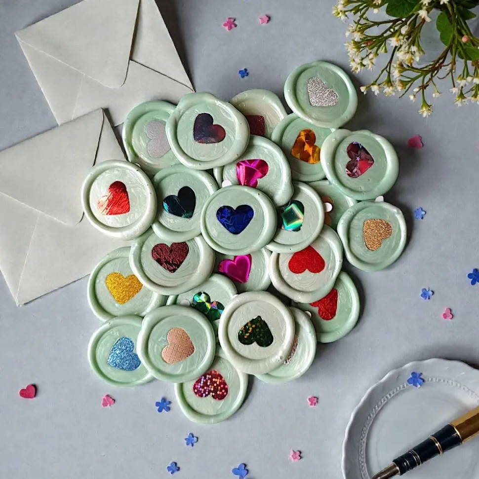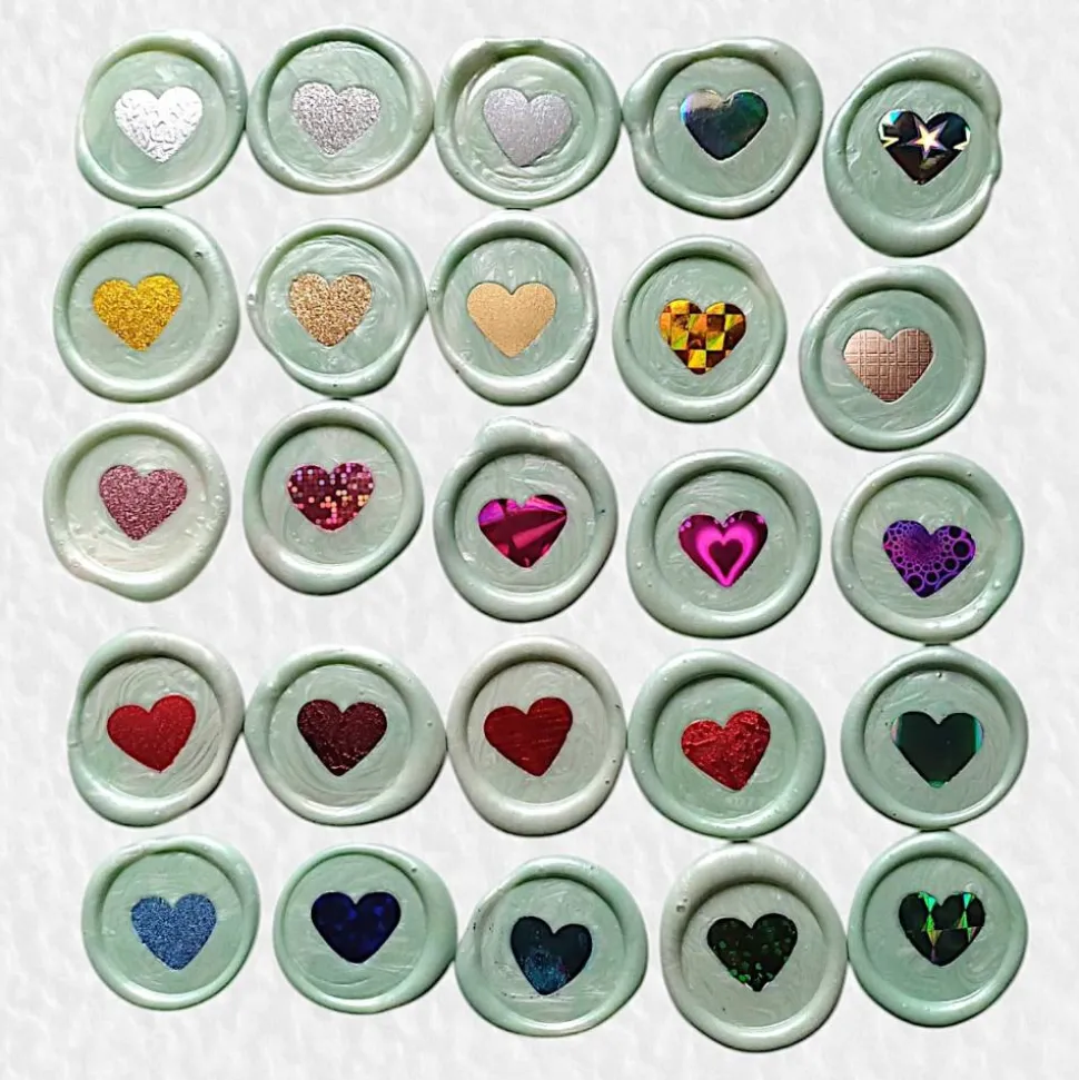 Verleihe deinen Briefen, Einladungen und Geschenken das gewisse Etwas! Mit diesen 50 handgemachten Wachssiegeln mit bunten Herzen erhältst du einzigartige Siegelaufkleber in 25 verschiedenen Farben. Jedes Siegel ist ein Unikat und bringt durch die eingegossenen Glitzerherzen einen besonderen Glanz auf deine Post.