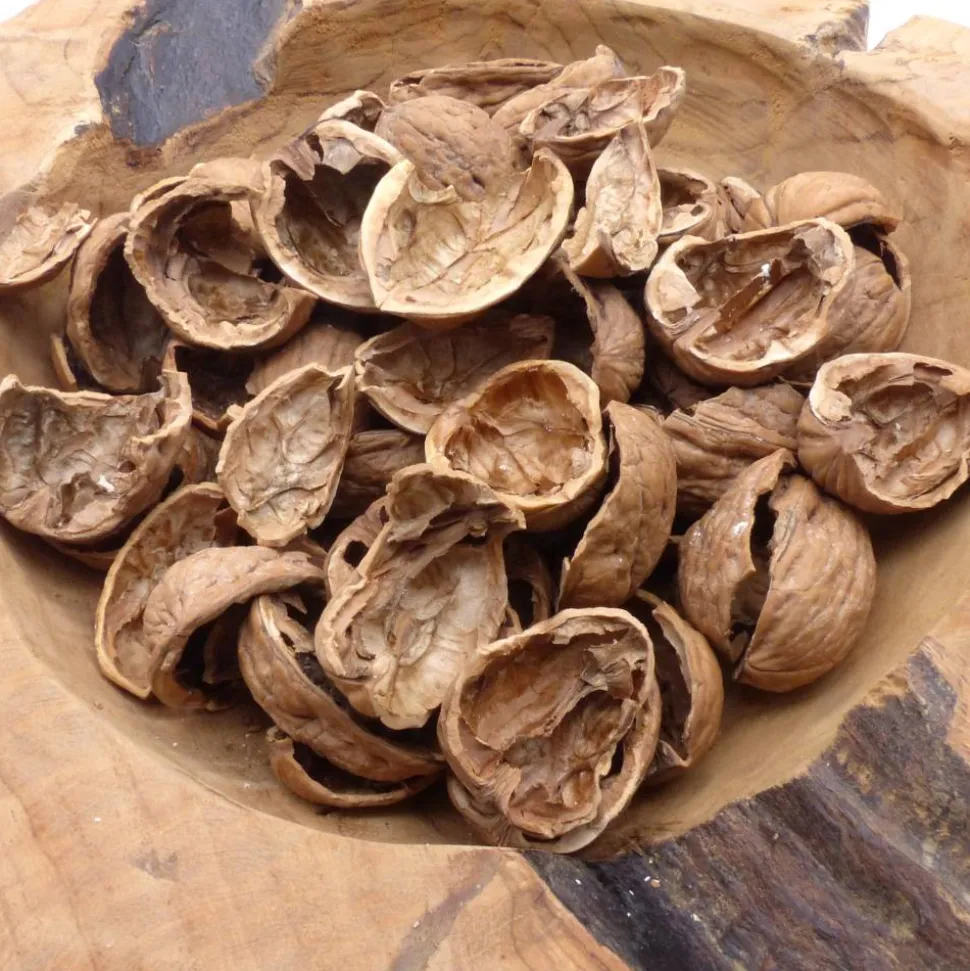 Bruchstücke von der Walsnussschale. Es handelt sich nicht um Halbschalen sondern um gebrochene Schalenstücke. Es handelt sich um ein Naturprodukt in unterschiedlicher Größe und Beschaffenheit.