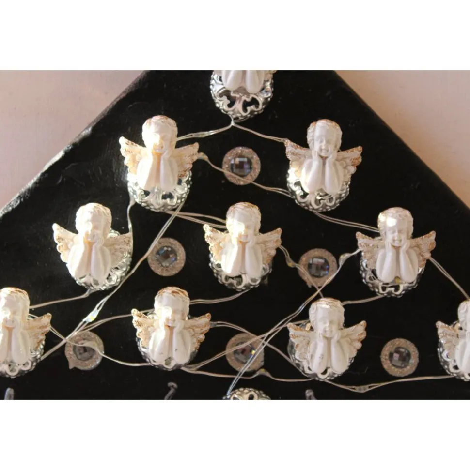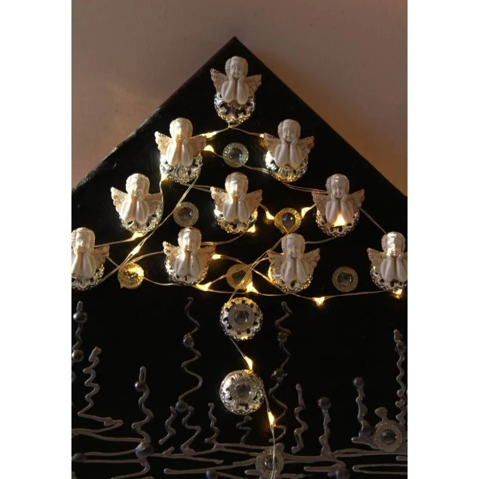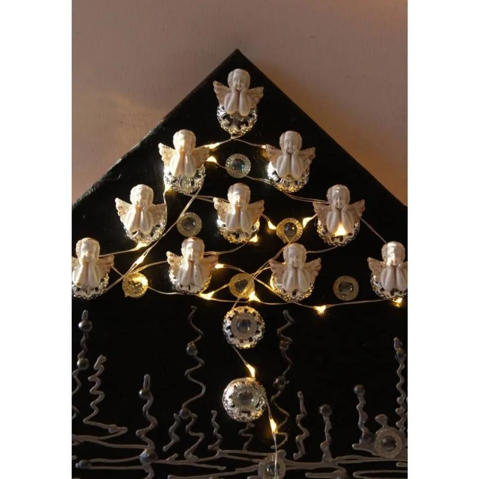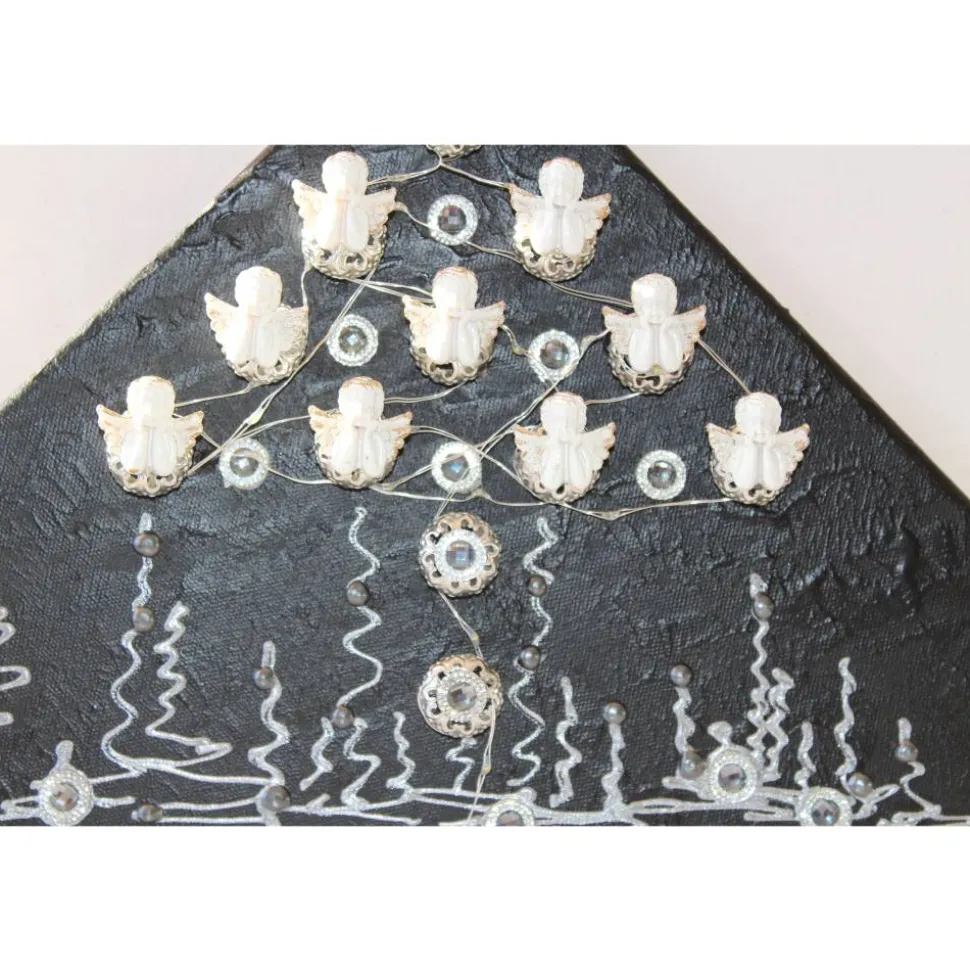 Bei diesem Modell handelt es sich um ein mit Engeln gestaltetes Objekt. Die Verzierung besteht aus kleinen Glitzersteinen und Metallkügelchen. Die Leinwand ist mit Acrylfarben gestaltet.