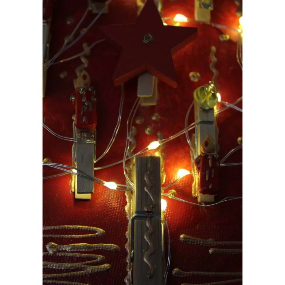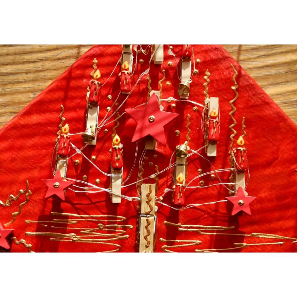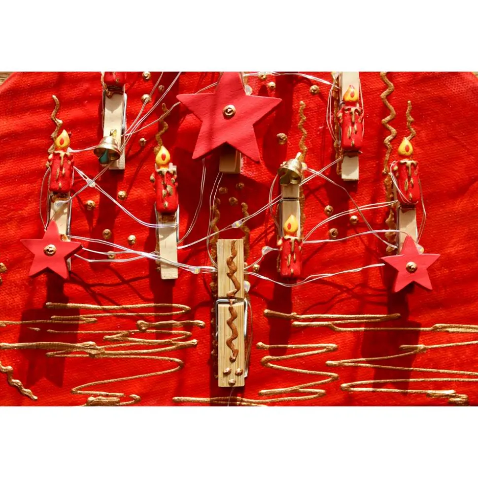 Bei diesem Modell „Klammerbäumchen“ handelt es sich um ein mit kleinen Klammern gestaltetes Objekt. Die Verzierung besteht aus kleinen Glöckchen, Kerzen aus Kunststoff, Holzsternen und Acrylfarben. Die Leinwand ist mit Acrylfarben gestaltet.