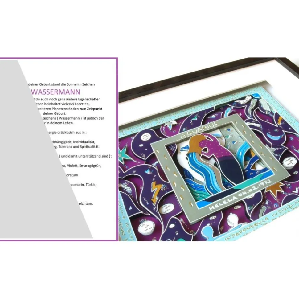 Diese 3D-Sternzeichenbilder werden im Bild beschriftet mit Ihrem Namen und Geburtsdatum. Sie sind daher ein ganz persönliches Geschenk, – für einen lieben Freund, Verwandten oder einfach für Sie selbst. Alle Sternzeichen-Bilder sind gerahmt ( Ready To Hang ). Auf der Rückseite der Rahmung : alle wichtigen Erläuterungen zu der Energie dieses Zeichens.