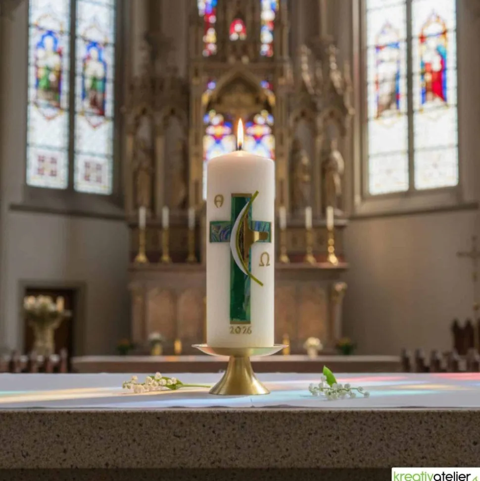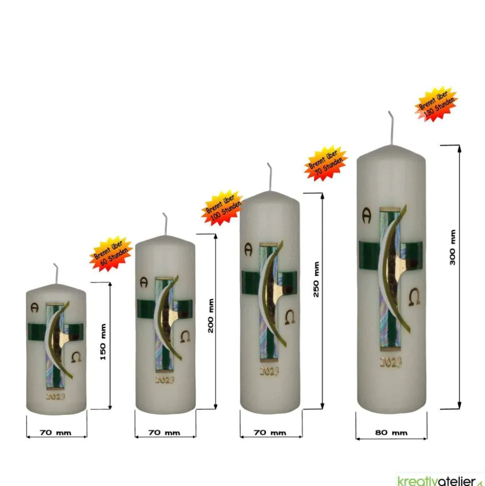 Die Osterkerze mit Kreuz, Alpha und Omega ist ein Symbol des Glaubens, an die Auferstehung Jesu und dessen Bedeutung für unser ewiges Leben. Das Kreuz erinnert an das Leiden und den Tod Jesu und steht für die Opferbereitschaft und die Liebe, die er uns gezeigt hat. Alpha und Omega sind die ersten und letzten Buchstaben des griechischen Alphabets und symbolisieren den Anfang und das Ende, den Beginn eines neuen Lebens. Diese Kerze ist eine wertvolle Ergänzung zur Feier des Osterfestes und eine Erinnerung an die Bedeutung dieses Ereignisses.