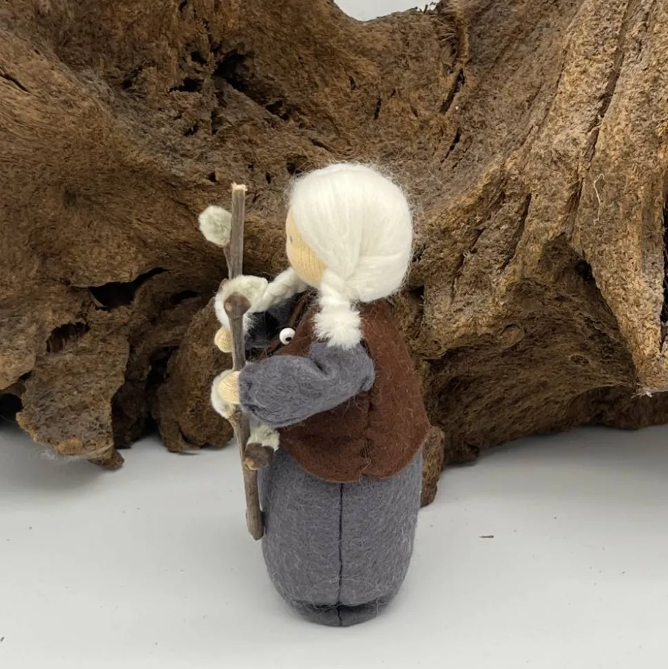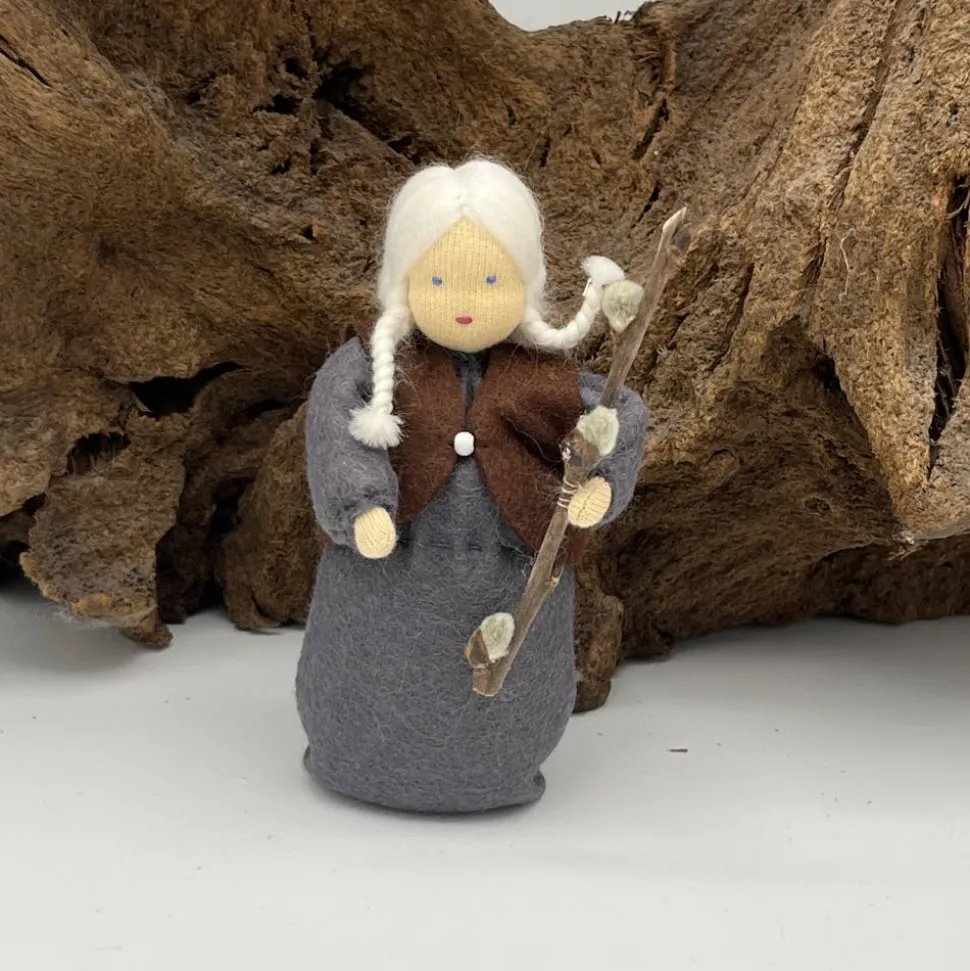 Das Püppchen ist unten geschlossen und für einen guten Stand unten mit feinem Dekokies und der Rest mit reiner Schurwolle gefüllt.