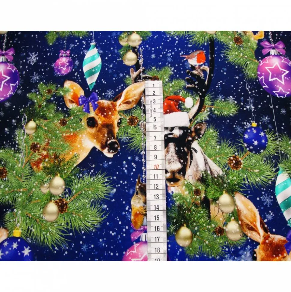 Erlebe den Zauber der Weihnachtszeit mit dem hochwertigen Digitaldruck Jersey Stoff-Panel mit Rehkitz, Hirsch und Weihnachtskugeln auf blauem Hintergrund. Dieses Panel ist die perfekte Wahl für stimmungsvolle Winter- und Weihnachtsmode.