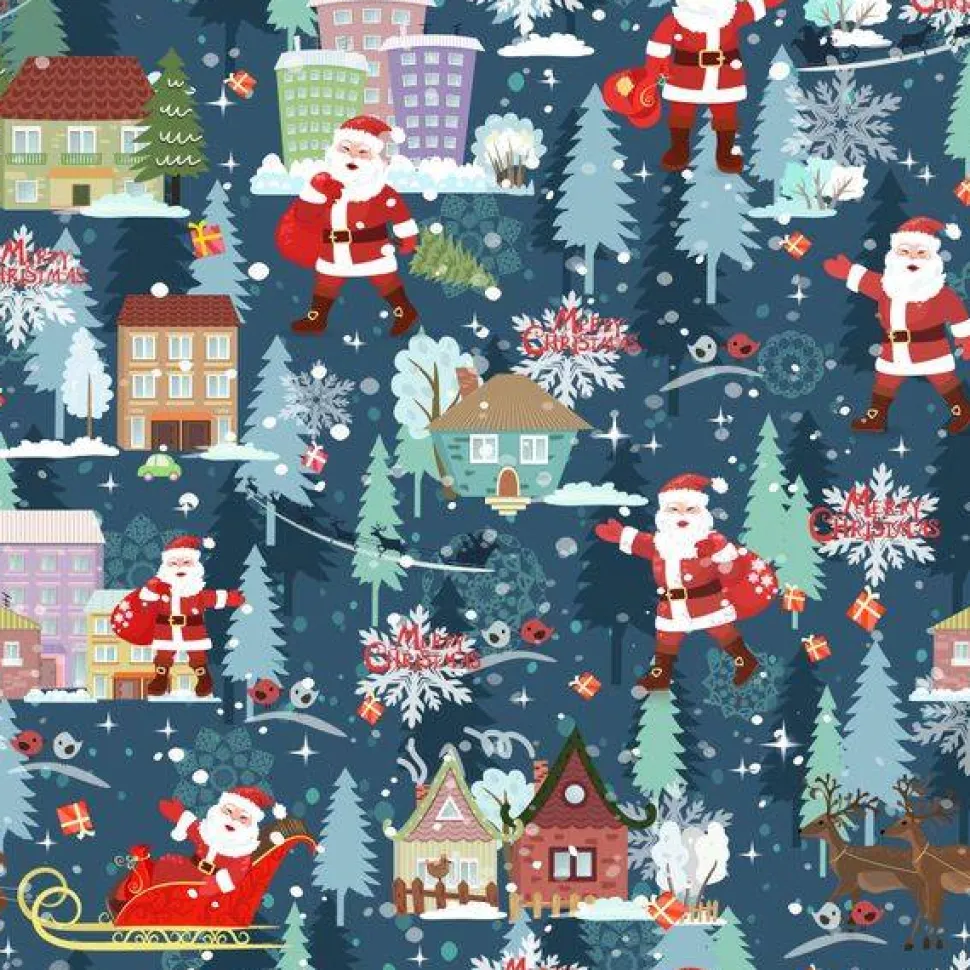 Entdecke unseren hochwertigen Weihnachten-Stoffe Baumwolldruck mit festlichem Weihnachtsmann-Motiv auf jeansblau!