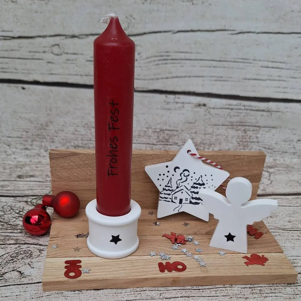 Das Set besteht aus einem kleinen Kerzenständer mit Stabkerze, die mit Wasserschieberfolie gestaltet wurde. Dazu kommt ein kleiner Schutzengel, ein Anhänger und dazu passende Streu-Deko. Alles ist liebevoll in einer rustikalen Holzbox aus Eiche verpackt.