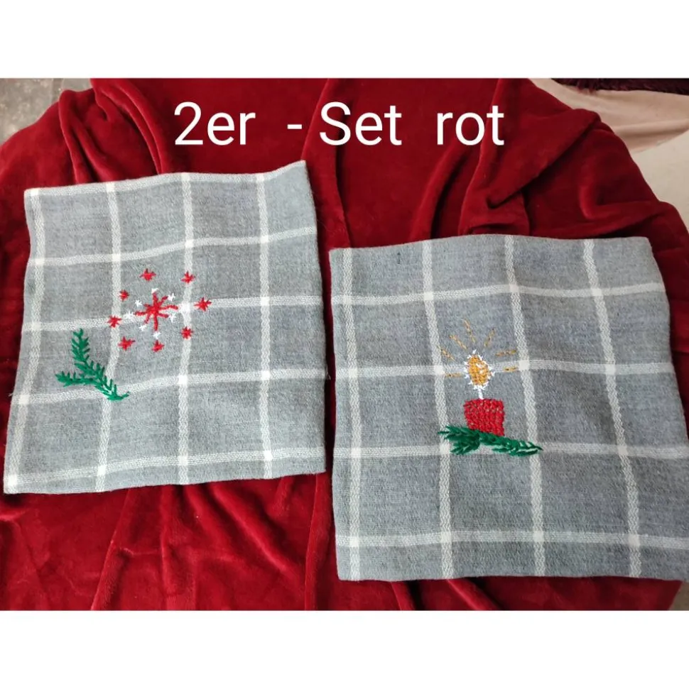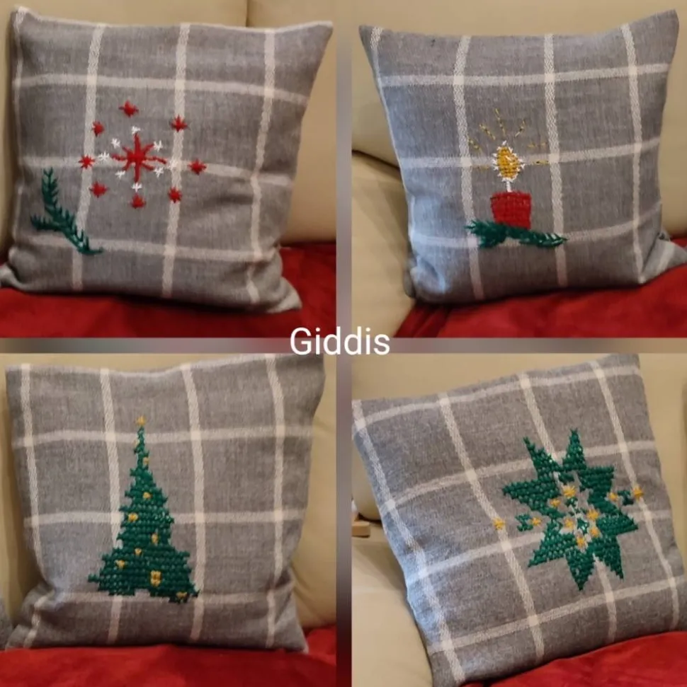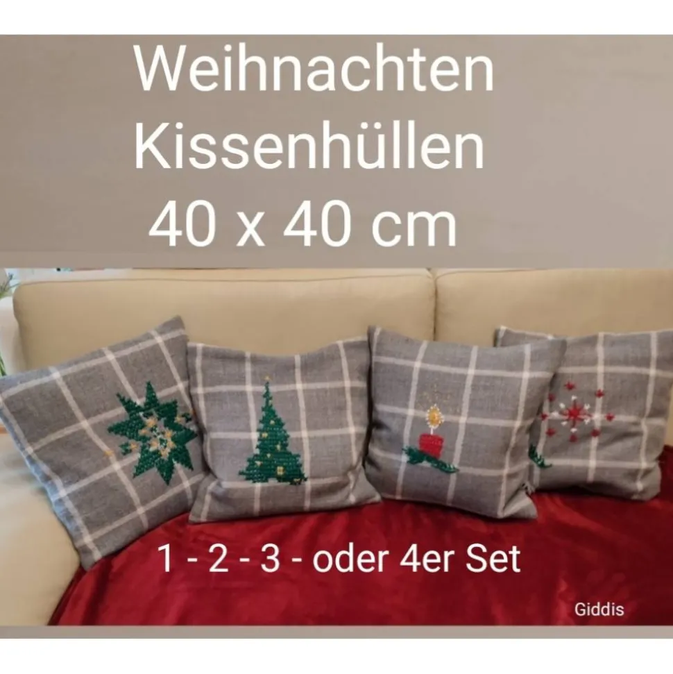 genähte festliche Kissenhüllen mit je einem anderen Weihnachtsmotiv handgestrickt