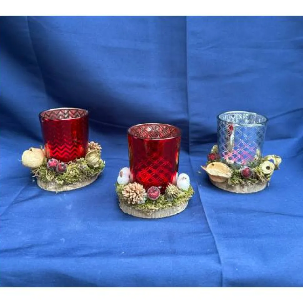 Unsere weihnachtlich dekorierten Teelichtgläser auf Naturholzscheiben bringen warmes Licht und eine gemütliche Atmosphäre in dein Zuhause. Jedes Glas ist liebevoll verziert mit kleinen Zapfen, Beeren, Moos und weihnachtlichen Naturmaterialien – ein echtes Unikat.