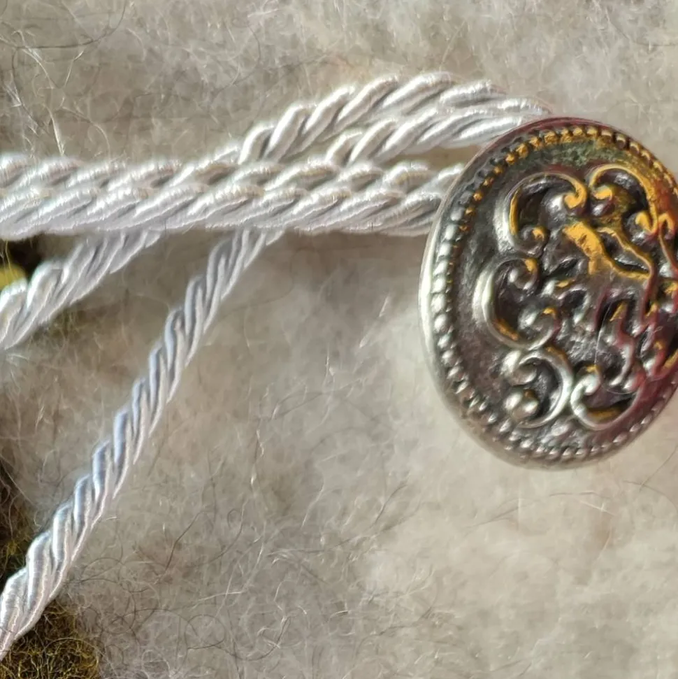 Verschlossen wird dieses Notizbuch mit einer silbernen Kordel die um das Buch geschlungen und an dem großen verzierten Metallknopf durch umwickeln befestigt wird.