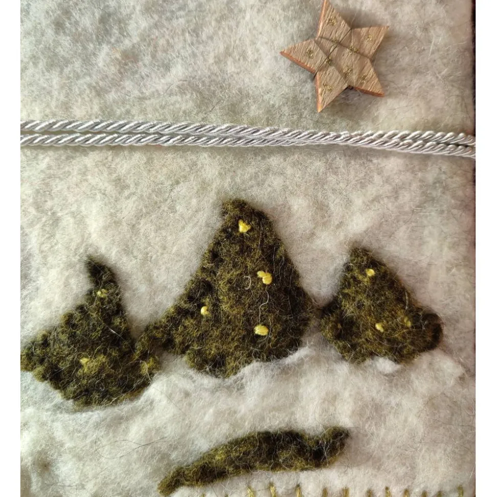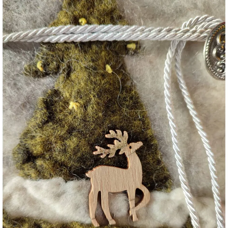 In creme mit grauer eingefilzter Wolle und angenähten handgefilzten Filzbäumen und angenähten Holzornamenten in Form von glitzernden Sternen und Rentier