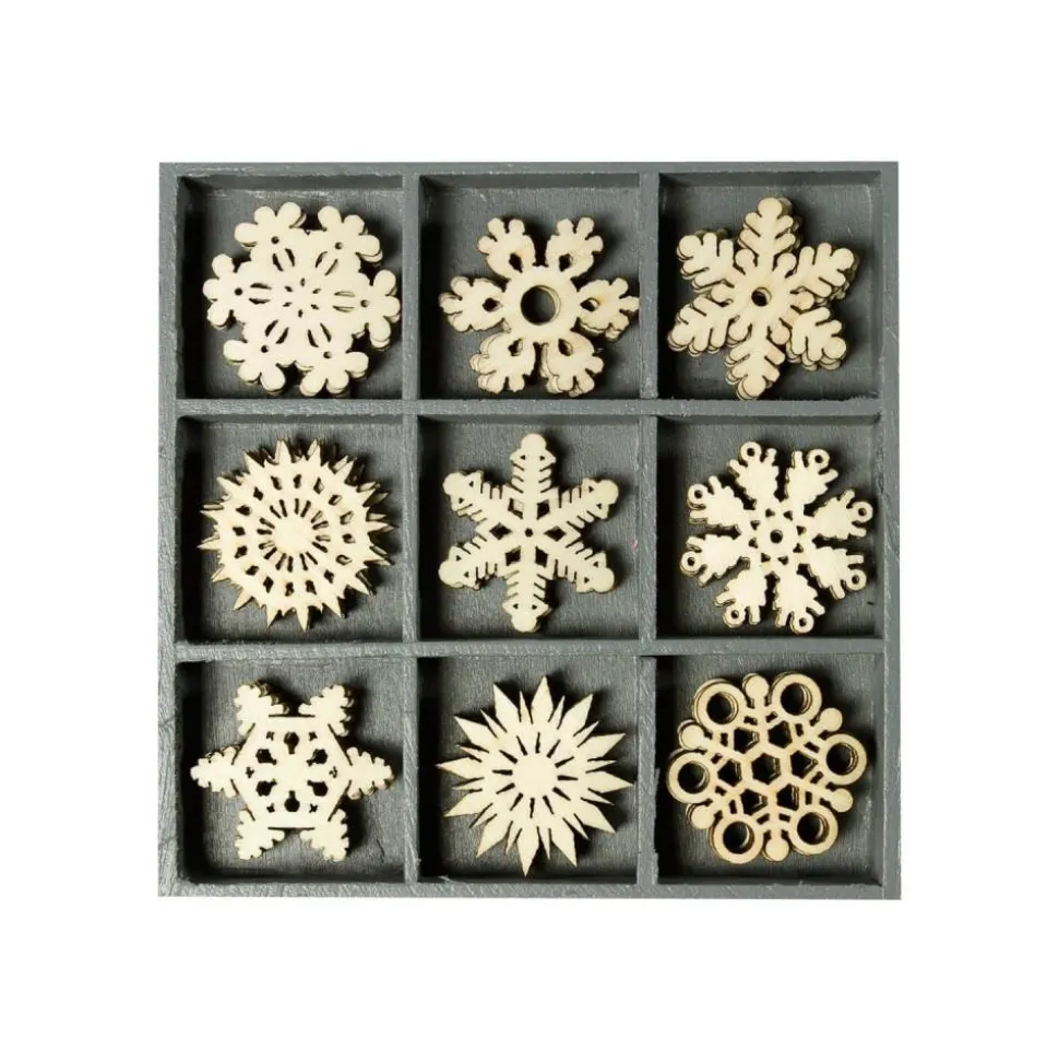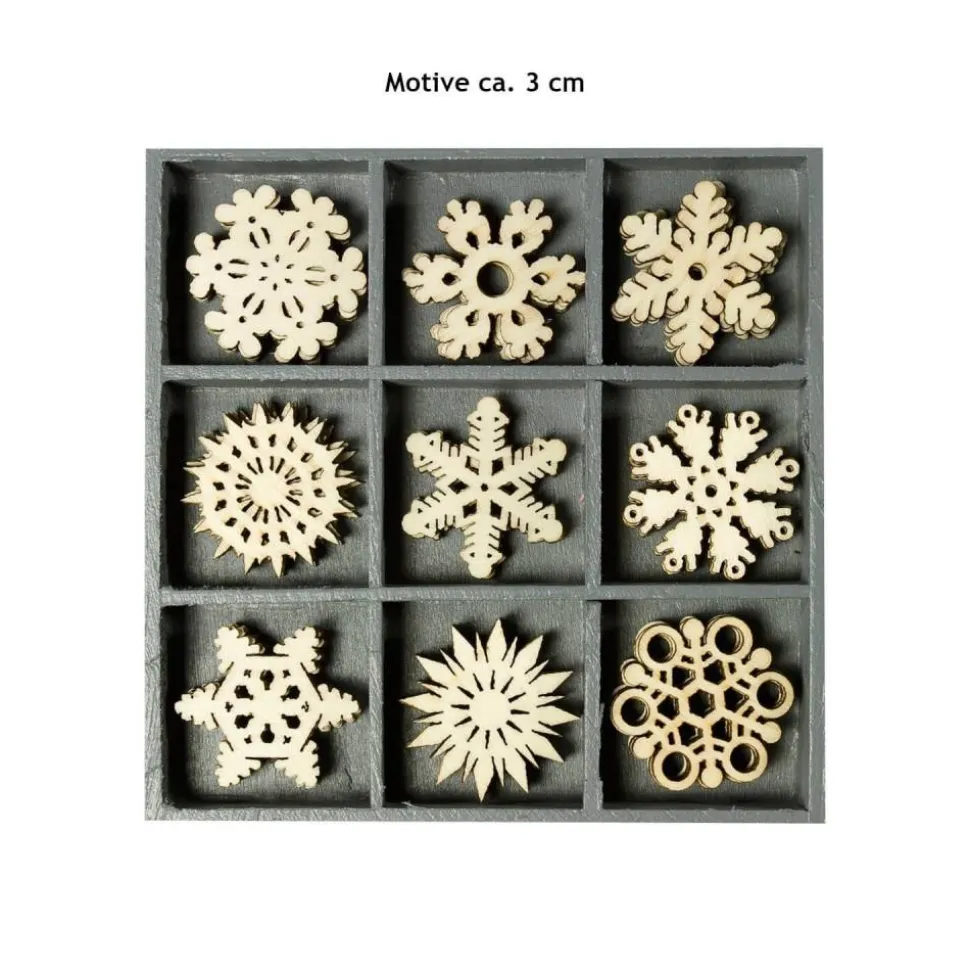 Die kleinen Holzteile haben eine Größe von ca. 3 cm. Die aus Sperrholz gefertigten Ornamente sind weihnachtlich oder winterlich gestaltet. Mit den Streuteilen lassen sich Adventskränze oder Weihnachtsgirlanden verzieren. Mit Kleber lassen sich sich auf verschiedenen Untergründen befestigen.
