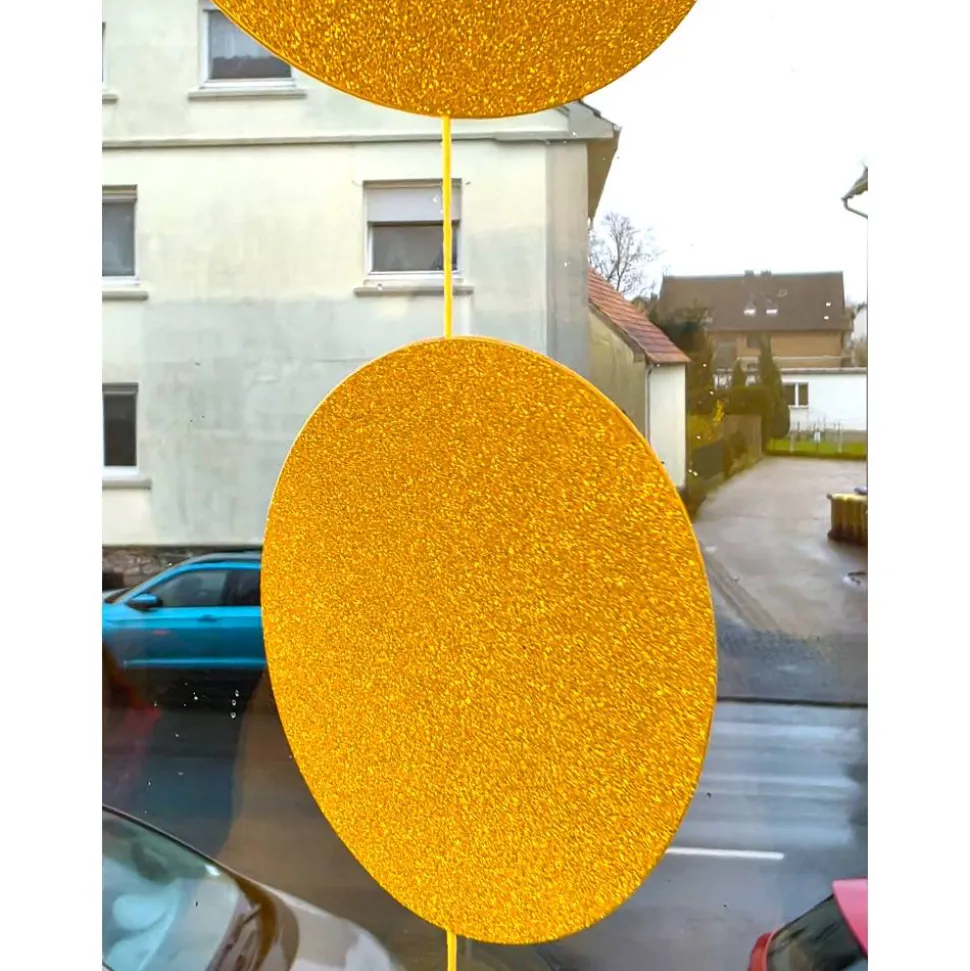 Der oberste Kreis trägt die festliche Botschaft ,, Frohe Weihnachten´´ in weißer Schrift, während die übrigen sieben kreise in funkelndem Gold schimmern – schlicht, edel und perfekt für Türen, Fenster oder Wände.