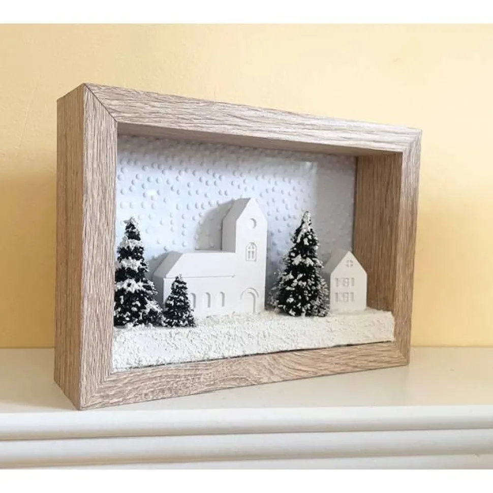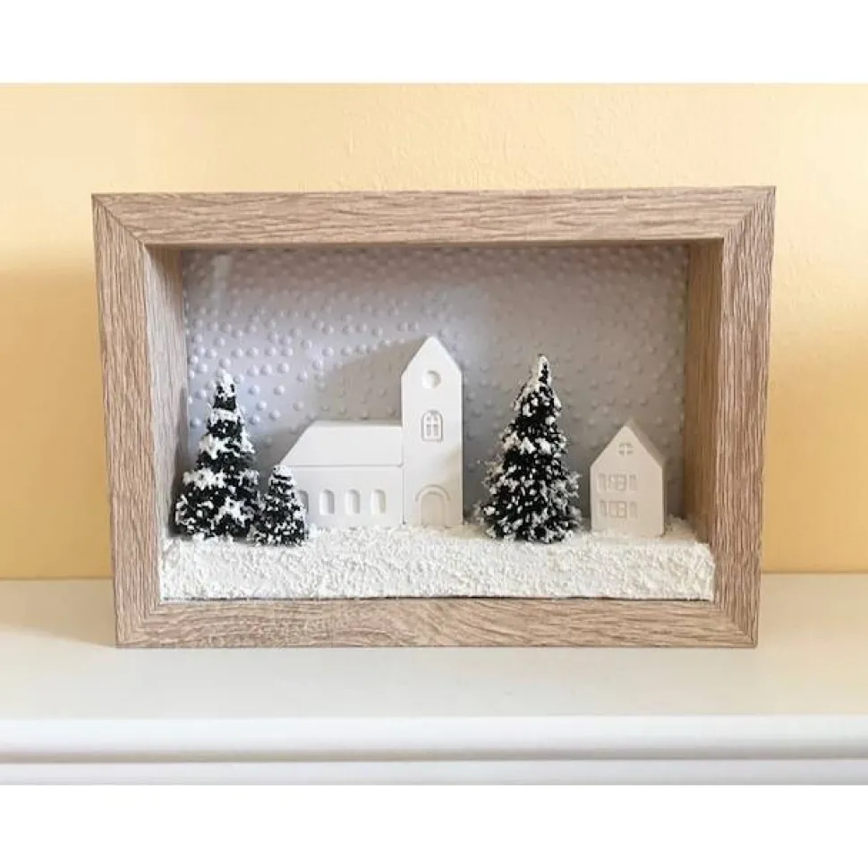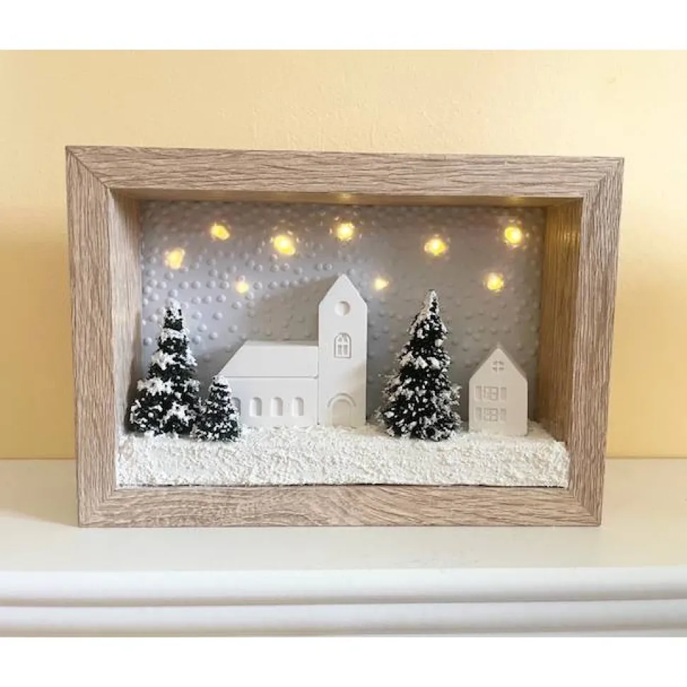 Weihnachtlicher Bilderrahmen mit einem verschneiten Dorf, liebevoll dekoriert und beleuchtet. Der tiefe Bilderrahmen in Holzoptik besitzt eine Tiefe von 4 cm und bringt winterliches Flair in dein Zuhause. Die geprägte, verschneite Rückwand liegt geschützt hinter einer Glasscheibe und sorgt für eine stimmungsvolle Atmosphäre.