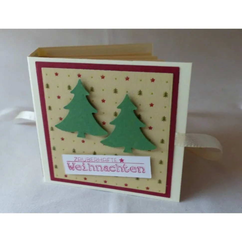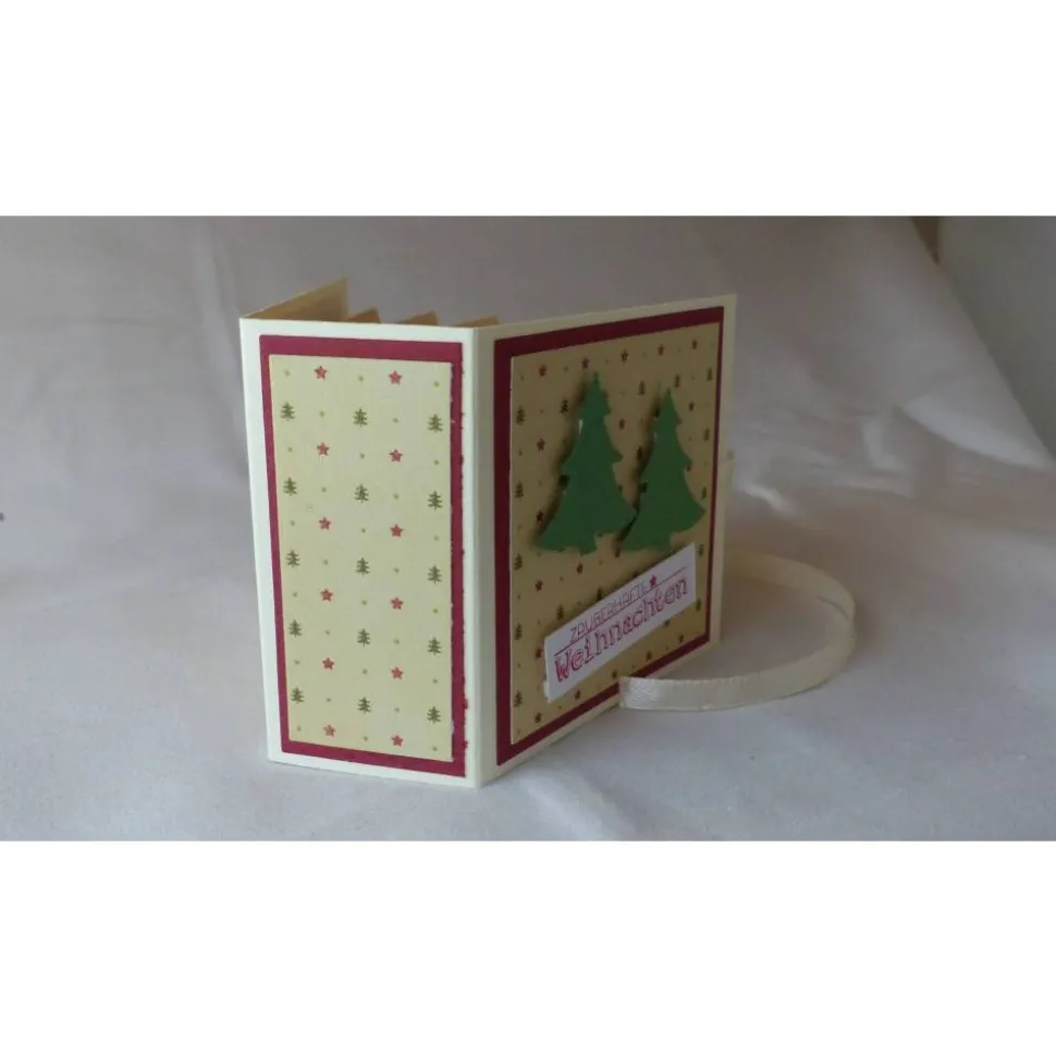 Das Büchlein ist aus dunkelgrünenFarbkarton mit weißen Rand und einem bedruckten Motivkarton gearbeitet.
