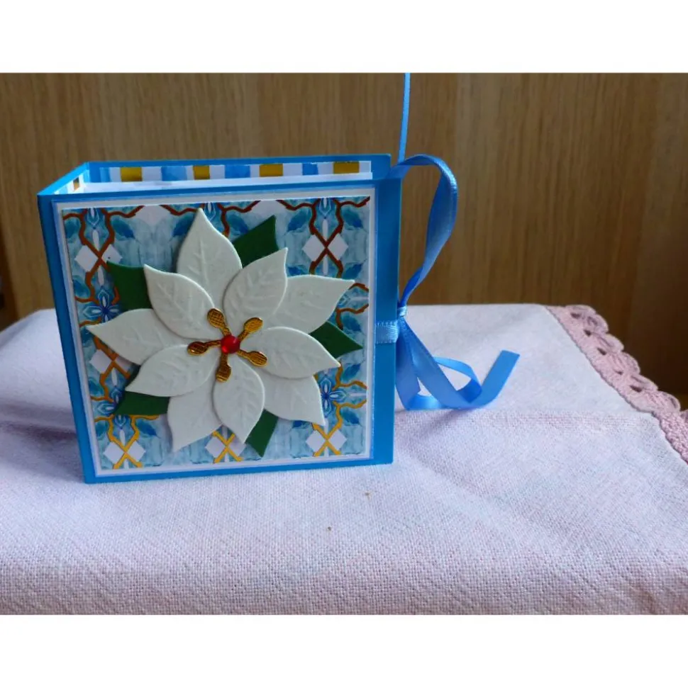 auf der Vorderseit wurde als Deko ein Weihnachtsstern in 3D verziert.Die Innenseiten sind mit gestreiften Motivpapier