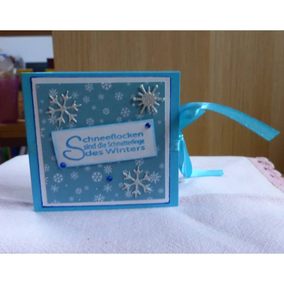 auf der Vorderseit wurde als Deko Schneeflocken,kleinen Spruchin 3D verziert.Die Innenseiten sind mit Motivpapier.gearbeitet.