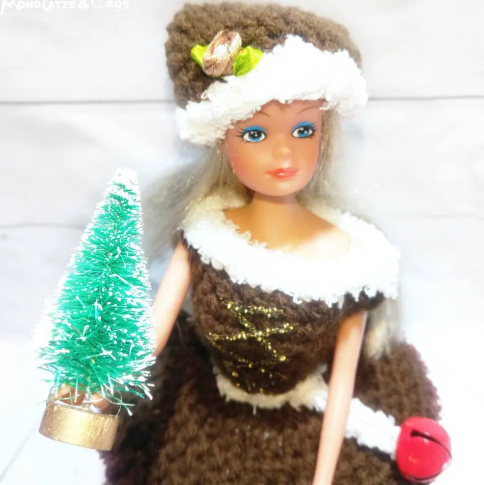 Sie trägt ein gehäkeltes Kleid in braun und weiß das mit Perlen verziert ist