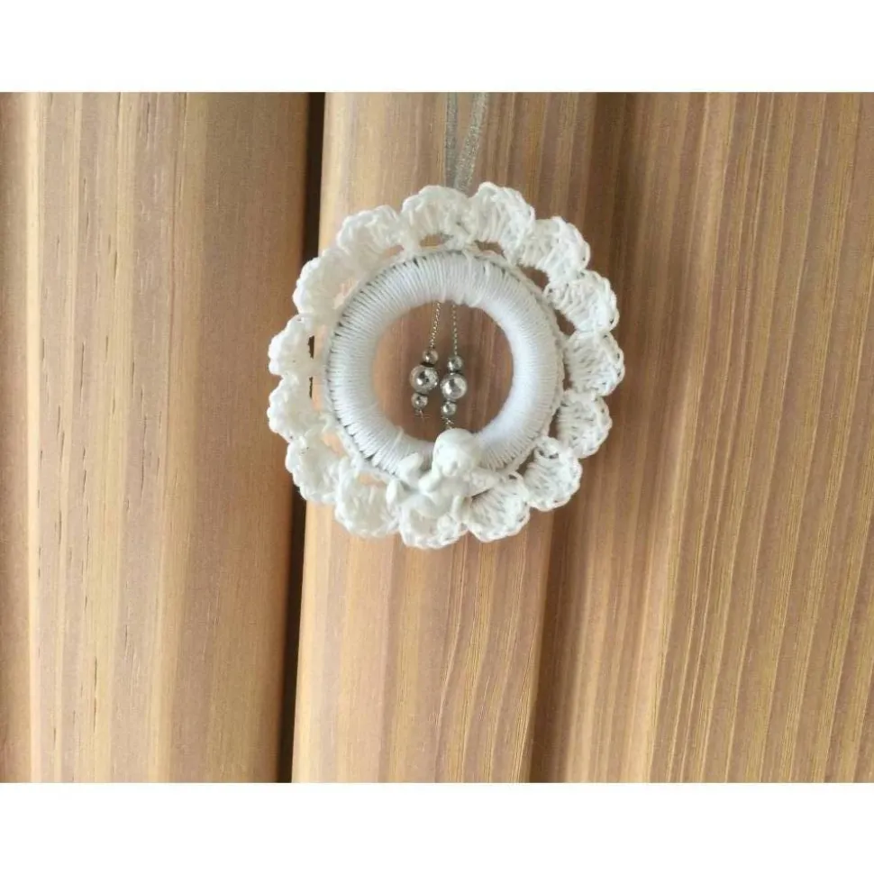 Das weihnachtliche Häkel-Kränzchen mit einer silberfarbenen Aufhänger-Schlaufe ist über einen Holzring von hand gehäkelt. Mit einem weißen Engelchen ist das weihnachtliche Kränzchen dekoriert. Im inneren Ring ist das Kränzchen mit zwei silbernen Perlensträngen verziert.