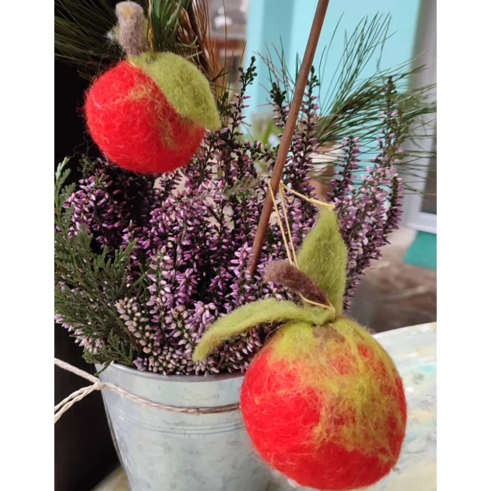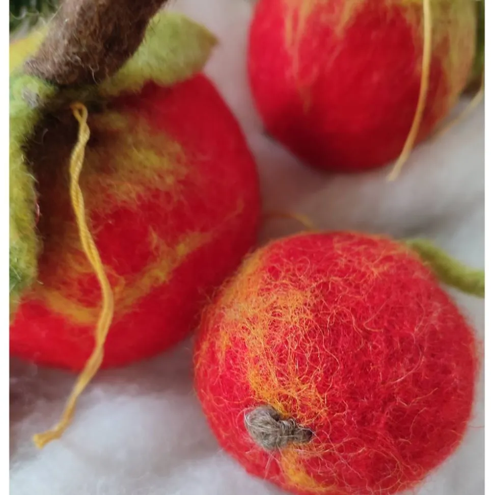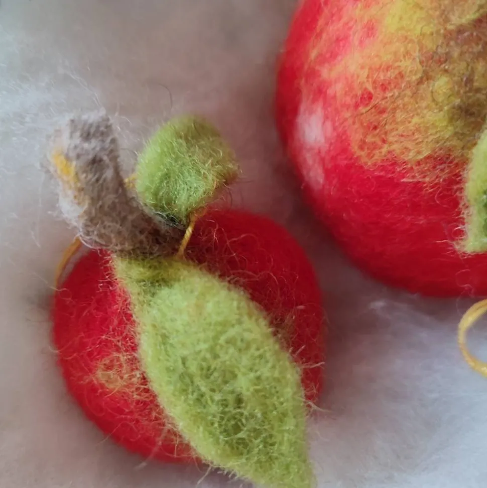 Er wurde um eine Styroporkugel gefilzt und zwei grüne Filzblätter hängen noch am Stiel, mit goldenem Aufhängeband.