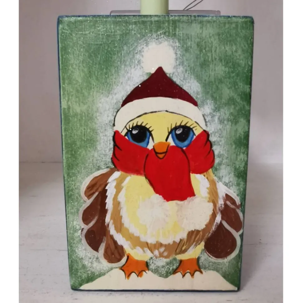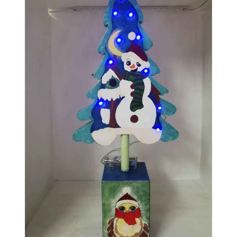 Der Weihnachtsbaum ist aus 28mm Leimholz gefertigt, bemalt mit ganz viel Liebe zum Detail, das VK Holz ist 10x10cm, auch sehr aufwendig bemalt, verwendet hab ich dafür Acrylfarben und abschließend zweimal wetterfest versiegelt. Er kann draussen stehen, die Lichterkette ist natürlich im Lieferumfang enthalten. Das Ganze ist ca 55cm hoch und 23cm breit, macht sich also sehr gut im Eingangsbereich oder auch an grossen Fenster.