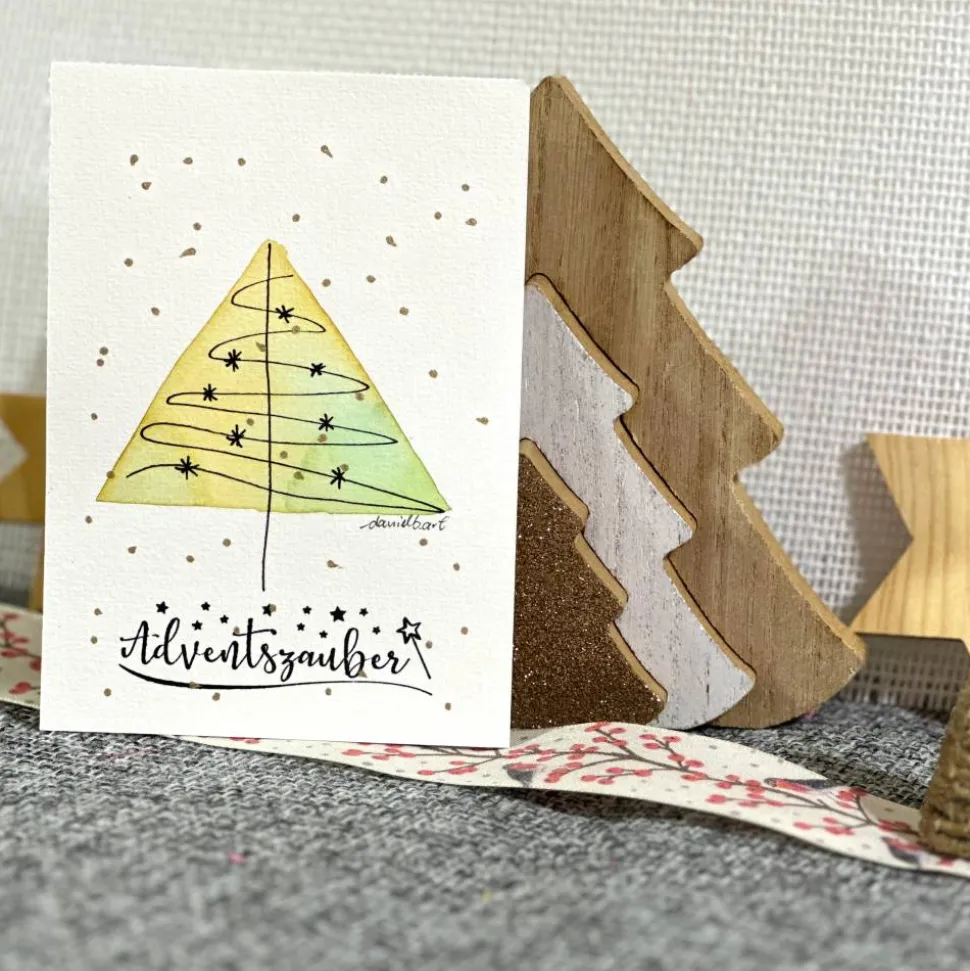 Weihnachtsbaum mit Aquarellfarbe & Fineliner auf Weihnachtskarte - Advent - Zauber - danielb.art