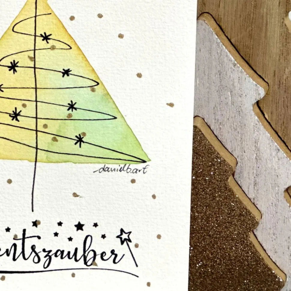 Weihnachtsbaum mit Aquarellfarbe & Fineliner auf Weihnachtskarte – Advent – Zauber – danielb.art