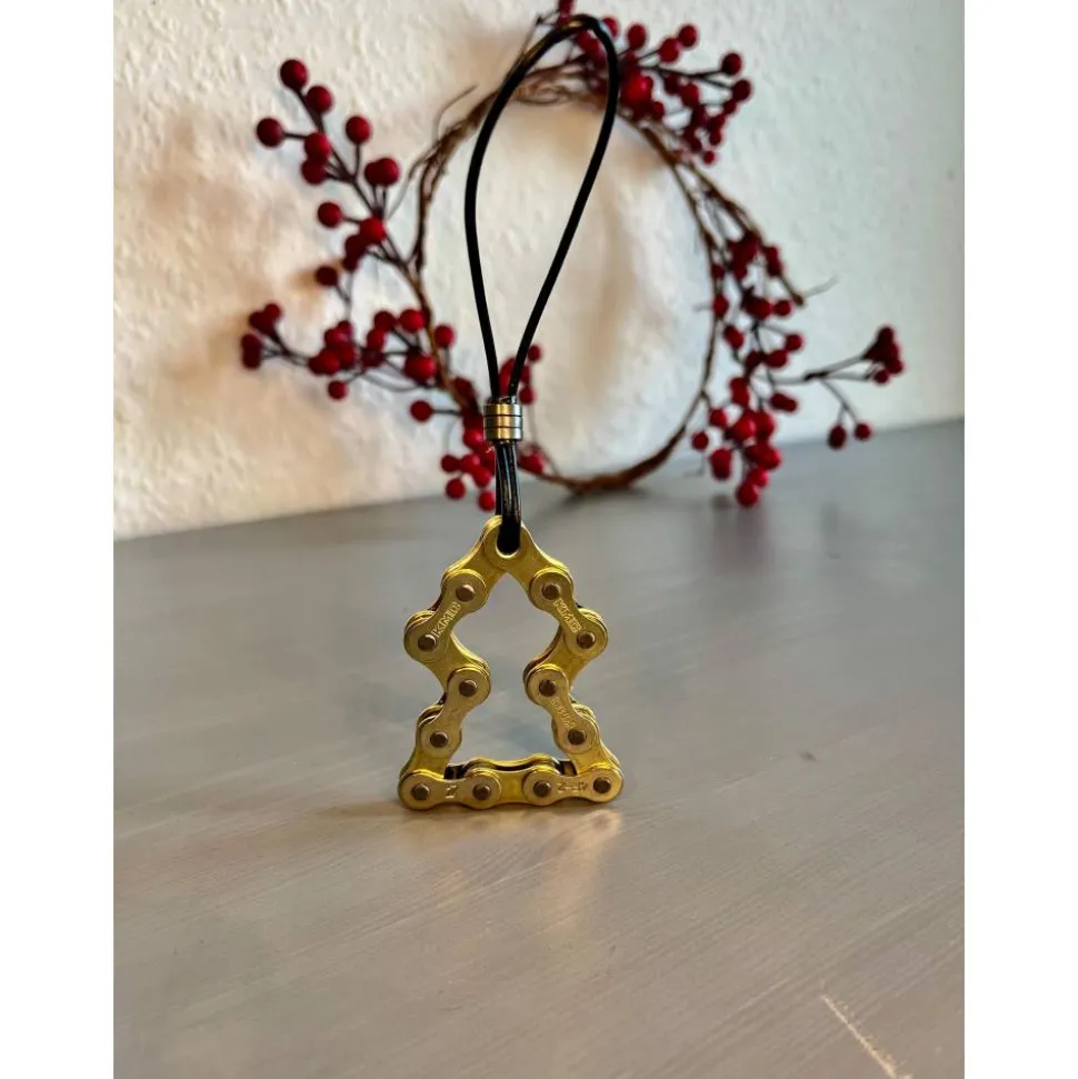 Die Glieder der Fahrradkette werden sorgfältig gereinigt, geformt und in eine stilvolle Form gebracht. Das robuste Metall und der industrielle, schlichte Look sorgen für einen spannenden Kontrast zu klassischer Weihnachtsdekoration und machen diesen Anhänger zu einem echten Blickfang – perfekt für moderne, minimalistische oder kreative Weihnachtsbäume.