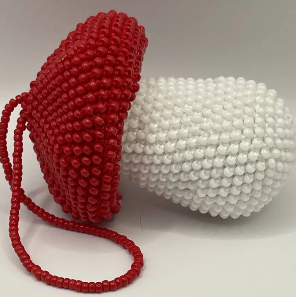 Die Glasperlen sind 2mm klein, diese werden alle auf das Baumwollgarn gefädelt. Der untere Teil ist mit zertifizierter Bastelwatte gefüllt. Im oberen Teil befindet sich im inneren eine Holzkugel.