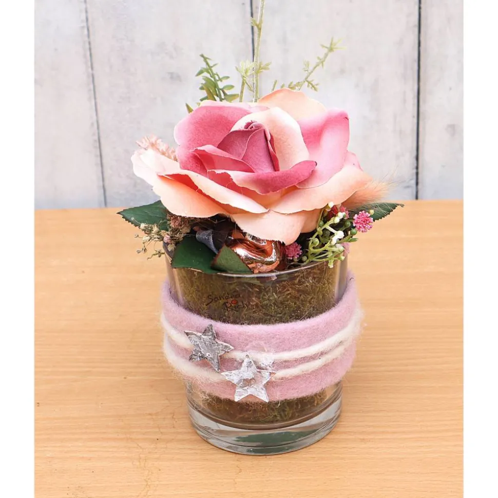 Schickes Tischgesteck in grün und rosa farbig mit einer großen Rose in der Mitte. Um das Glas herum habe ich ein breites Filzband und Filzkordel arrangiert, so haben Sie lange Freude an diesem Arrangement. Als weiteren kleinen Akzent habe ich noch zwei kleine Sterne angebracht.