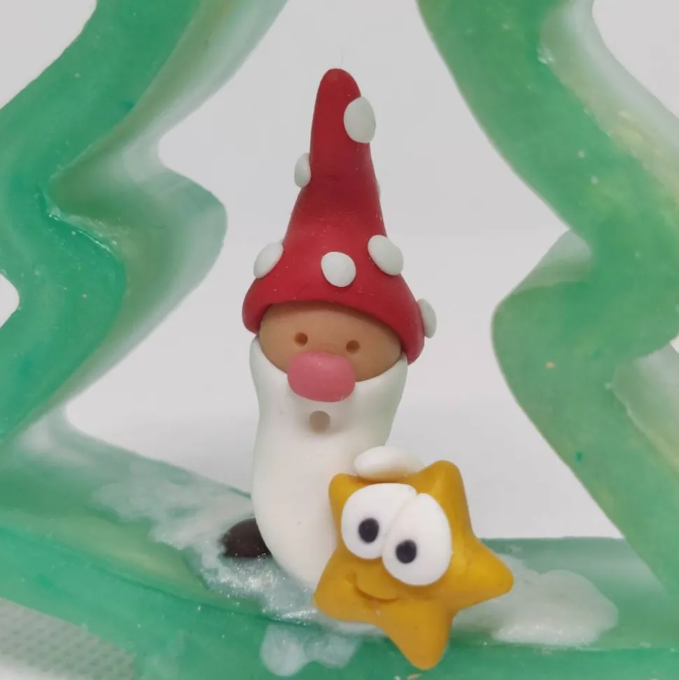 Im Inneren sitzt ein niedlicher Wichtel aus Polymer Clay. Er trägt eine rote Zipfelmütze mit weißen Punkten, hat eine kleine rosige Nase und bringt einen fröhlich blickenden goldigen Stern mit. Jede Figur mit liebe modelliert und ein echtes Unikat.