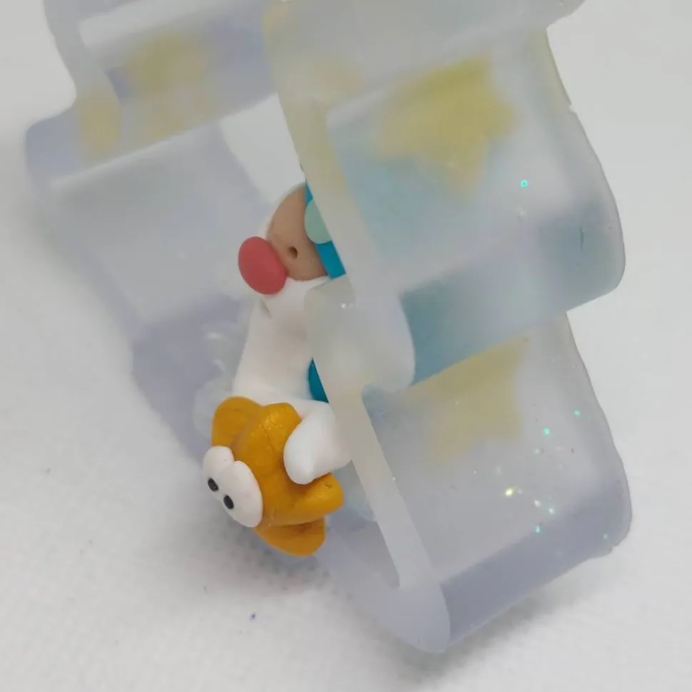 Im Inneren sitzt ein niedlicher kleiner Wichtel aus Polymer Clay. Er trägt eine türkisfarbene Mütze mit nachtleuchtenden Punkten und hält einen kleinen goldenen Stern mit fröhlichem Gesicht fest. Jede Figur ist sorgfältig von Hand modelliert und dadurch ein echtes Unikat