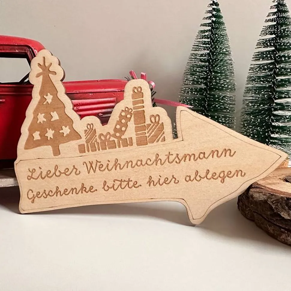 Das Schild ist als Pfeil geformt und weist so auf die Stelle hin, an der die Geschenke vom Weihnachtsmann abgelegt werden sollen. Die Gravur erinnert an eine Kinderhandschrift und ist somit eine ganz besonderes Hinweisschild welches Kinder für Santa aufstellen können.