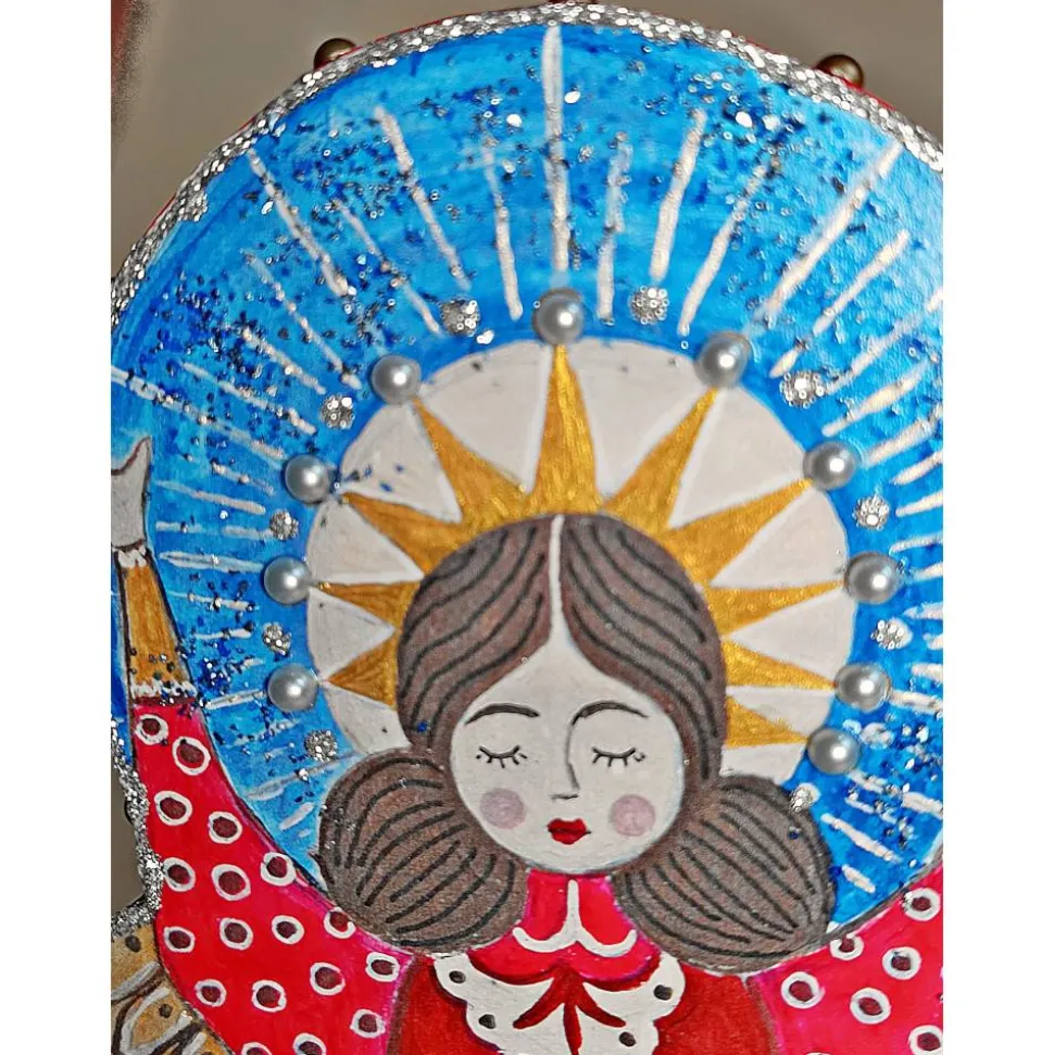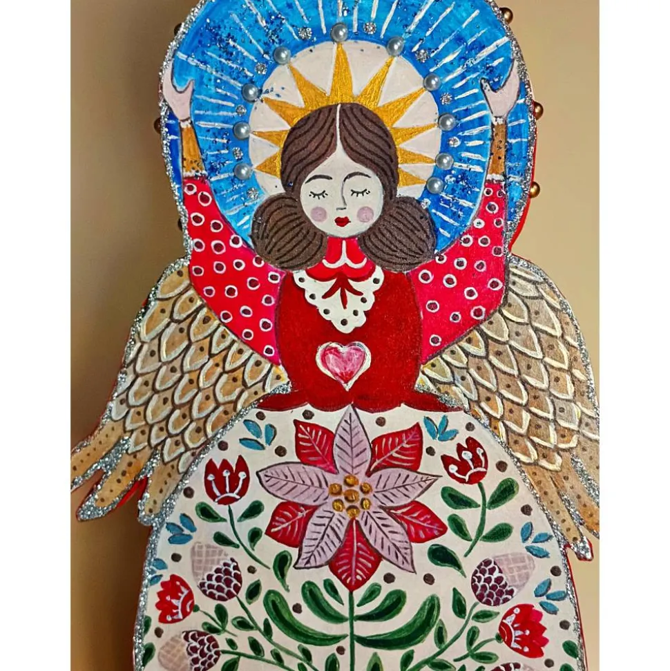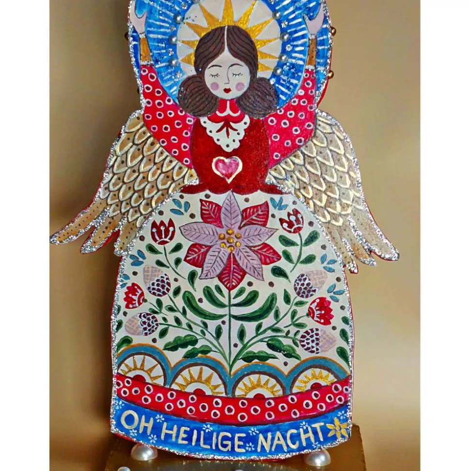 Verwandle Dein Zuhause in eine festliche Weihnachtswelt mit diesem einzigartigen Weihnachtsengel Tischaufsteller „Heilige Nacht“. Dieses handgemachte Unikat begeistert mit liebevoll gemalten Blumen- und Pflanzenornamenten im nordischen Stil. Die Hauptfarben Rot, Goldgelb und Blau sorgen für eine warme, stilvolle Atmosphäre.